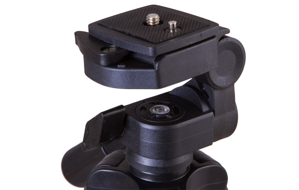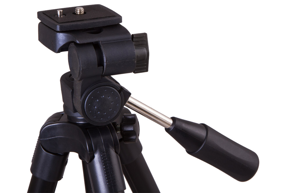 Установочная площадка из прочного пластика поворачивается по горизонтали и вертикали с помощью удобной ручки. Штатив рассчитан на оптические приборы весом до 5 кг. Высота в рабочем положении составляет от 38 до 130 см. Длина штатива в полностью сложенном состоянии – 41 см.