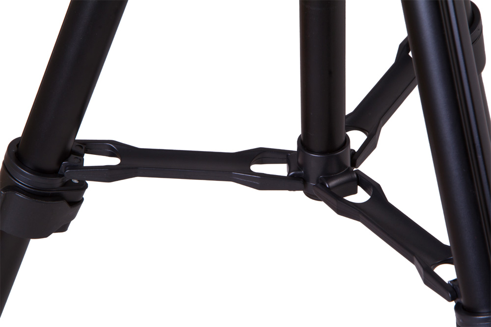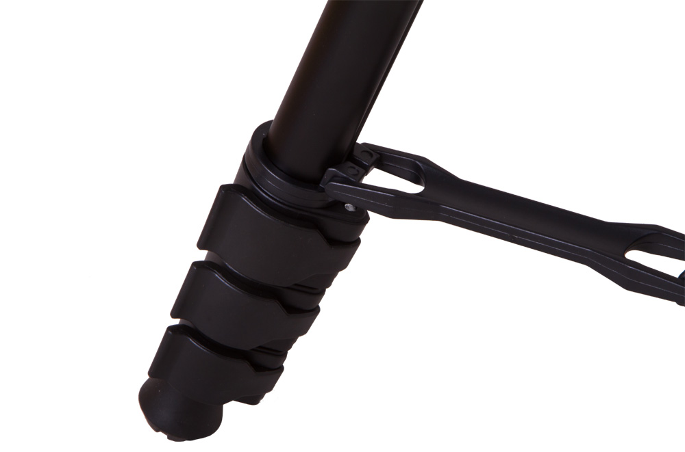 У штатива металлические ножки регулируемой длины. Каждая состоит из 4 секций, они фиксируются клипсовыми зажимами. На сборку штатива уйдет не больше минуты. Встроенный пузырьковый уровень помогает контролировать положение установочной площадки. Рельефные пластиковые наконечники ножек не дают штативу скользить. Центральная распорка увеличивает жесткость конструкции.
