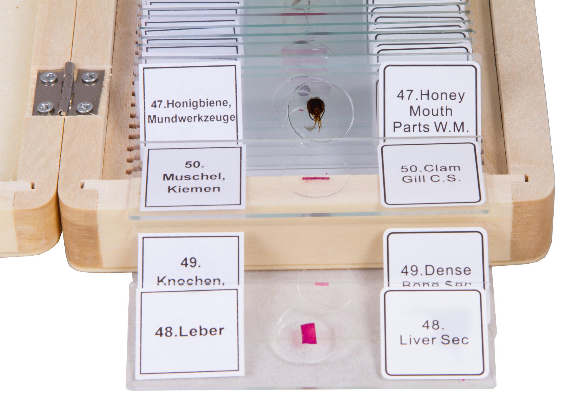 В набор включено 50 готовых микропрепаратов. Для их хранения используется прочный деревянный кейс.