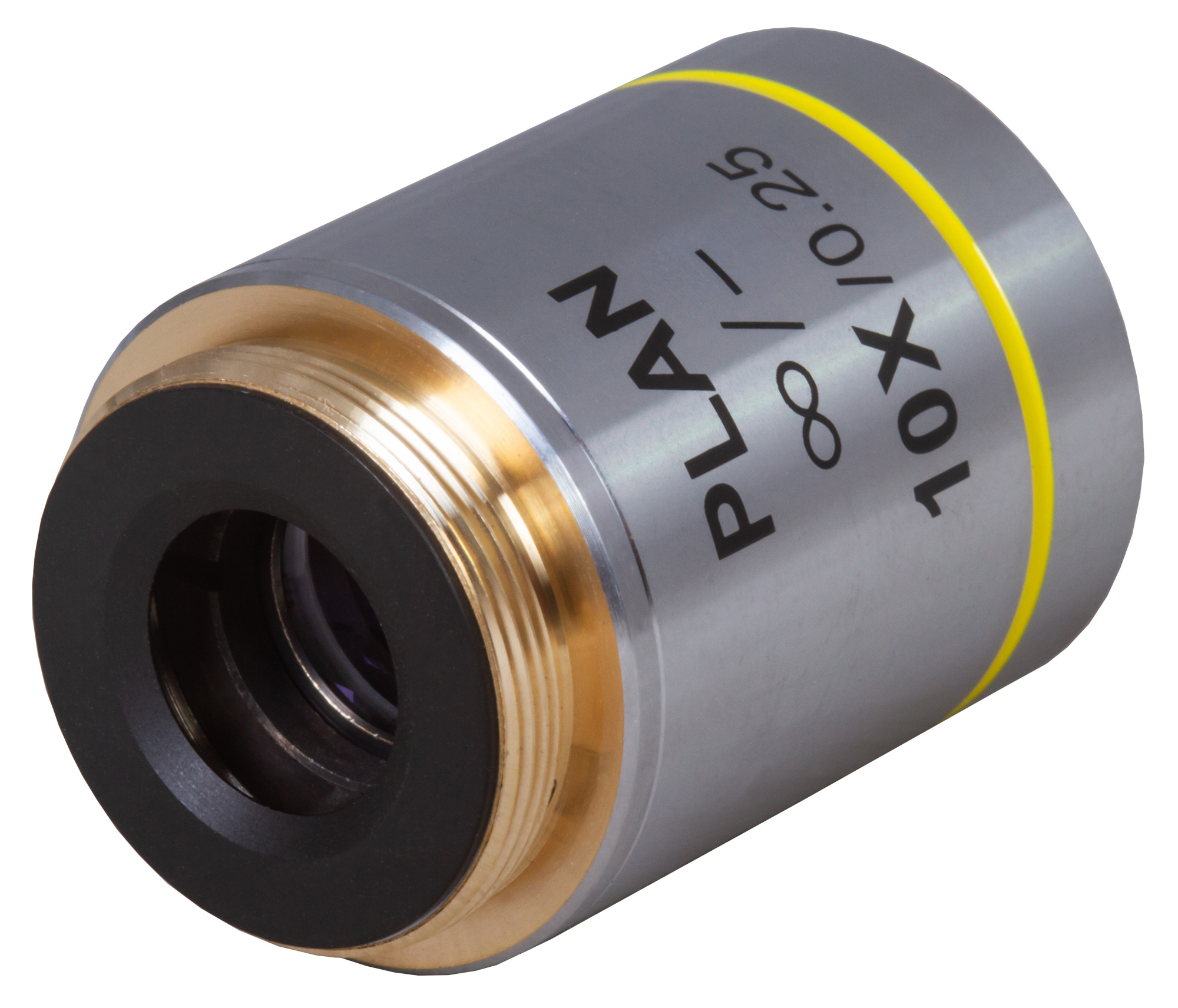 Планахроматический объектив Levenhuk MED 10x/беск – аксессуар для микроскопов, длина тубуса которых скорректирована на бесконечность. Подобные микроскопы широко применяются в лабораториях, так как позволяют свободно использовать дополнительные исследовательские инструменты – поляризаторы, фазово-контрастные устройства и другие.