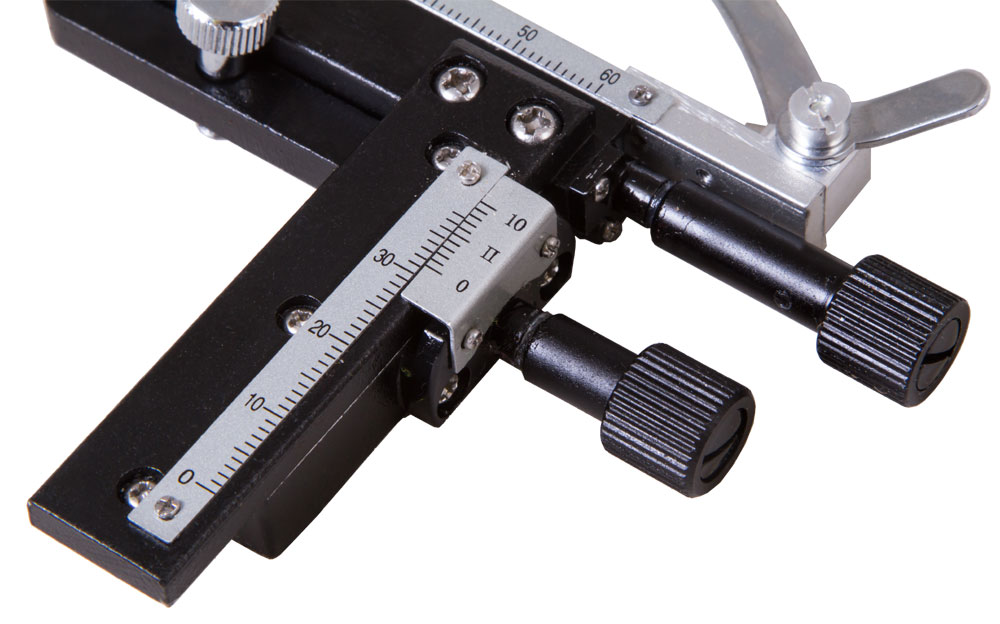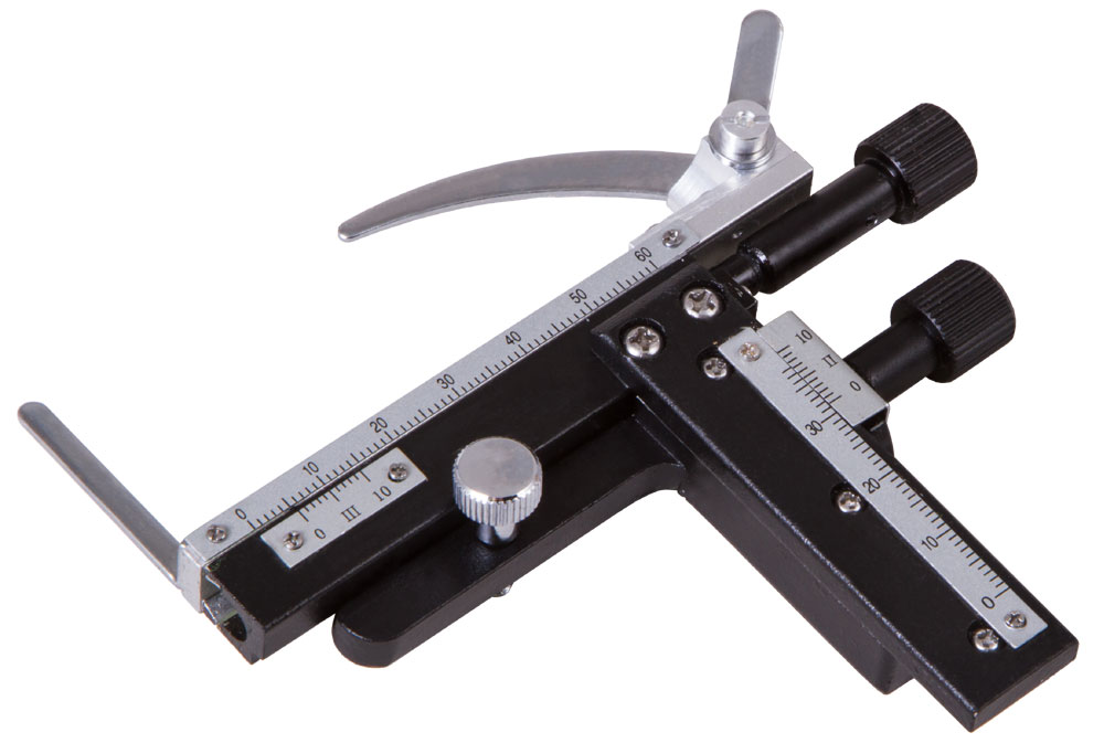 Препаратоводитель Levenhuk MS3 служит для перемещения микропрепаратов на предметном столике и точного определения координат их расположения. Перемещать препараты можно в двух направлениях – по оси Y (вперед-назад) и по оси X (вправо-влево). Координаты фиксируются при помощи двух основных измерительных шкал и вспомогательных шкал-нониусов.