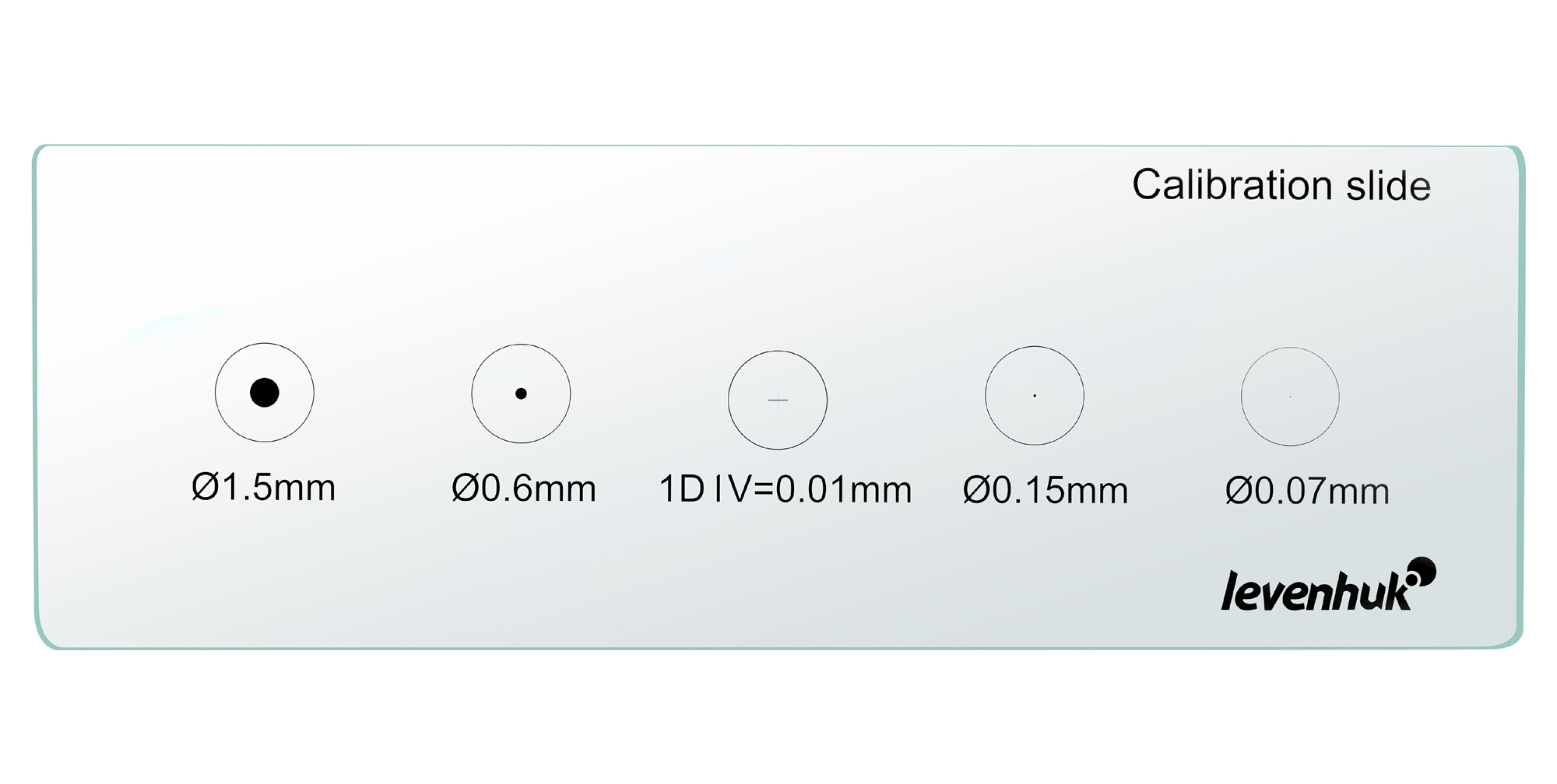 Перед вами калибровочный слайд Levenhuk MED X/Y, который предназначен для удобной и быстрой калибровки программы анализа изображений. Его можно использовать с микроскопами любых марок. Слайд представляет собой прозрачное стекло с нанесенными на него изображениями микрометрической шкалы (цена деления – 0,01 мм) и окружностей разного диаметра (1,5 мм, 0,6 мм, 0,15 мм и 0,07 мм). Эти калибровочные элементы позволяют быстро и точно определить поправочный коэффициент, который программа будет учитывать при переводе значений из одних реальных единиц в другие.