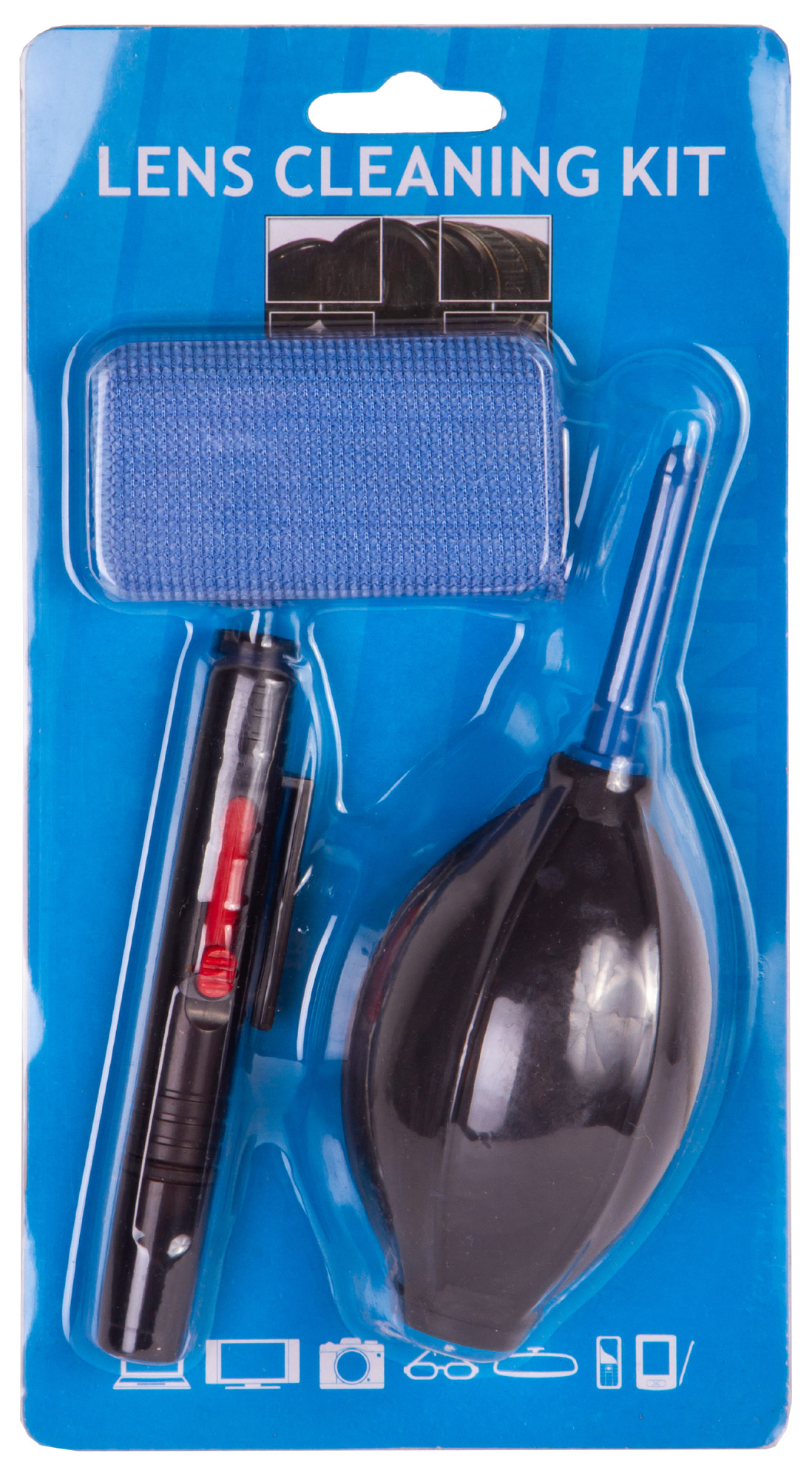 Воздушная груша используется для сдувания частиц пыли с оптики, чистящий карандаш предназначен для тщательного ухода за линзами, в том числе и с просветляющими покрытиями, салфетку можно применять для ухода за разными поверхностями оптических и фотоприборов.