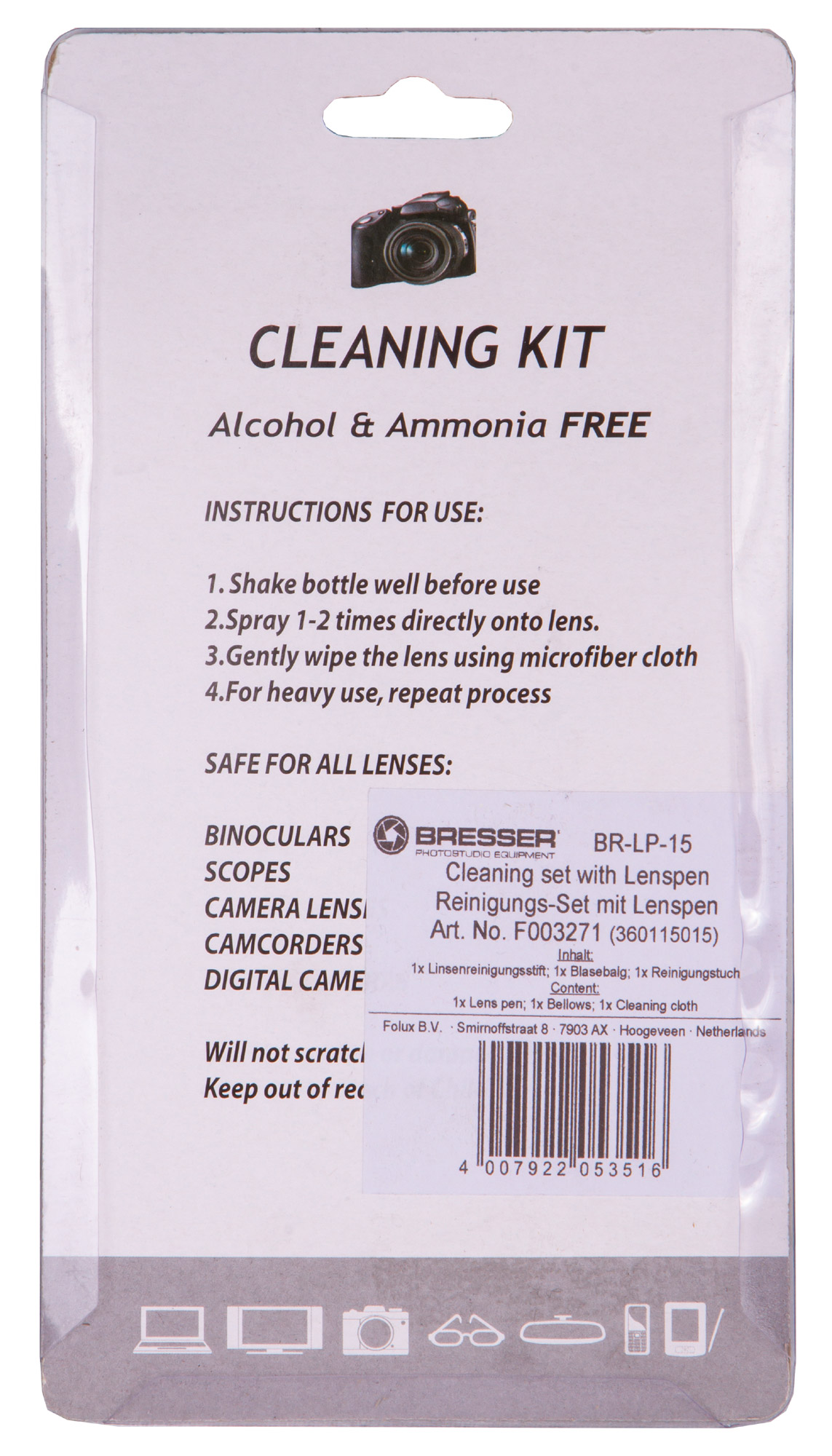 Набор Bresser BR-LP15 включает в себя три предмета для ухода за линзами оптических приборов и матрицами фото- и видеокамер. Это универсальный набор для очистки оптики, который позволяет убирать с разных поверхностей пыль, грязь и следы жира. Пригодится всем владельцам оптической техники.