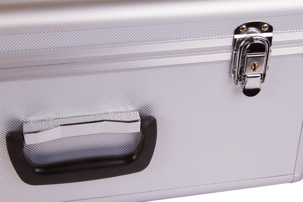 Кейс изготовлен из алюминия. Ручка обеспечивает удобную транспортировку.
