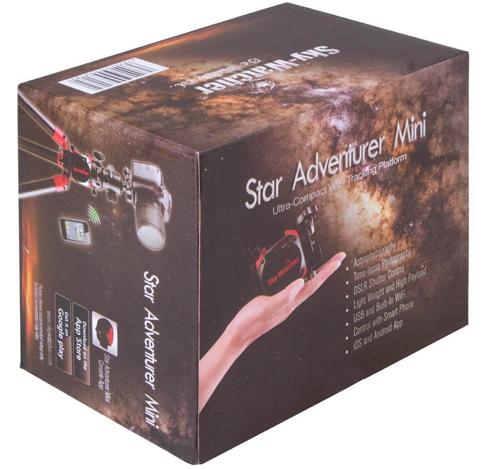 Sky-Watcher Star Adventurer Mini – монтировка-астротрекер, которую по достоинству оценят любители астрофотографии. Она компактная, легкая, надежная и позволяет с максимальным комфортом фотографировать ночное небо. На монтировку можно установить фотоаппарат или оптическую трубу весом не более 3 кг. Для этого используется стандартное крепление «ласточкин хвост». Sky-Watcher Star Adventurer Mini – прекрасный выбор для поездок и походов, так как она без труда помещается в небольшой рюкзак или сумку.