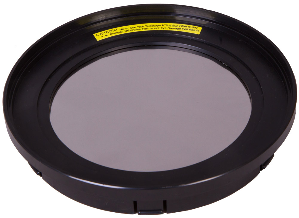 Солнечный фильтр Sky-Watcher нужен для того, чтобы изучать солнечную активность без вреда для зрения. Он разработан специально для рефлекторов с апертурой 114 мм, устанавливается на трубу телескопа и перекрывает собой весь световой диаметр. В результате блокируется солнечное излучение, небезопасное для глаз. Коэффициент светопропускания светофильтра не превышает 0,001%.