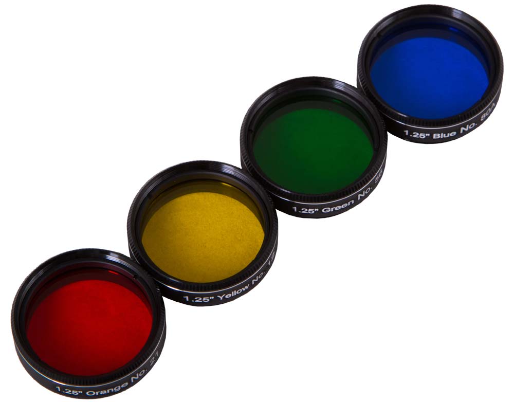 Набор светофильтров Explore Scientific №2 пригодится каждому астроному. С помощью входящих в него фильтров вы сможете подробнее изучить Луну и планеты Солнечной системы – увидеть больше деталей в структурах облаков газовых гигантов и на поверхности спутника Земли. Для получения максимально четкой и детализированной картинки светофильтры рекомендуется использовать с телескопами с апертурой свыше 100 мм.