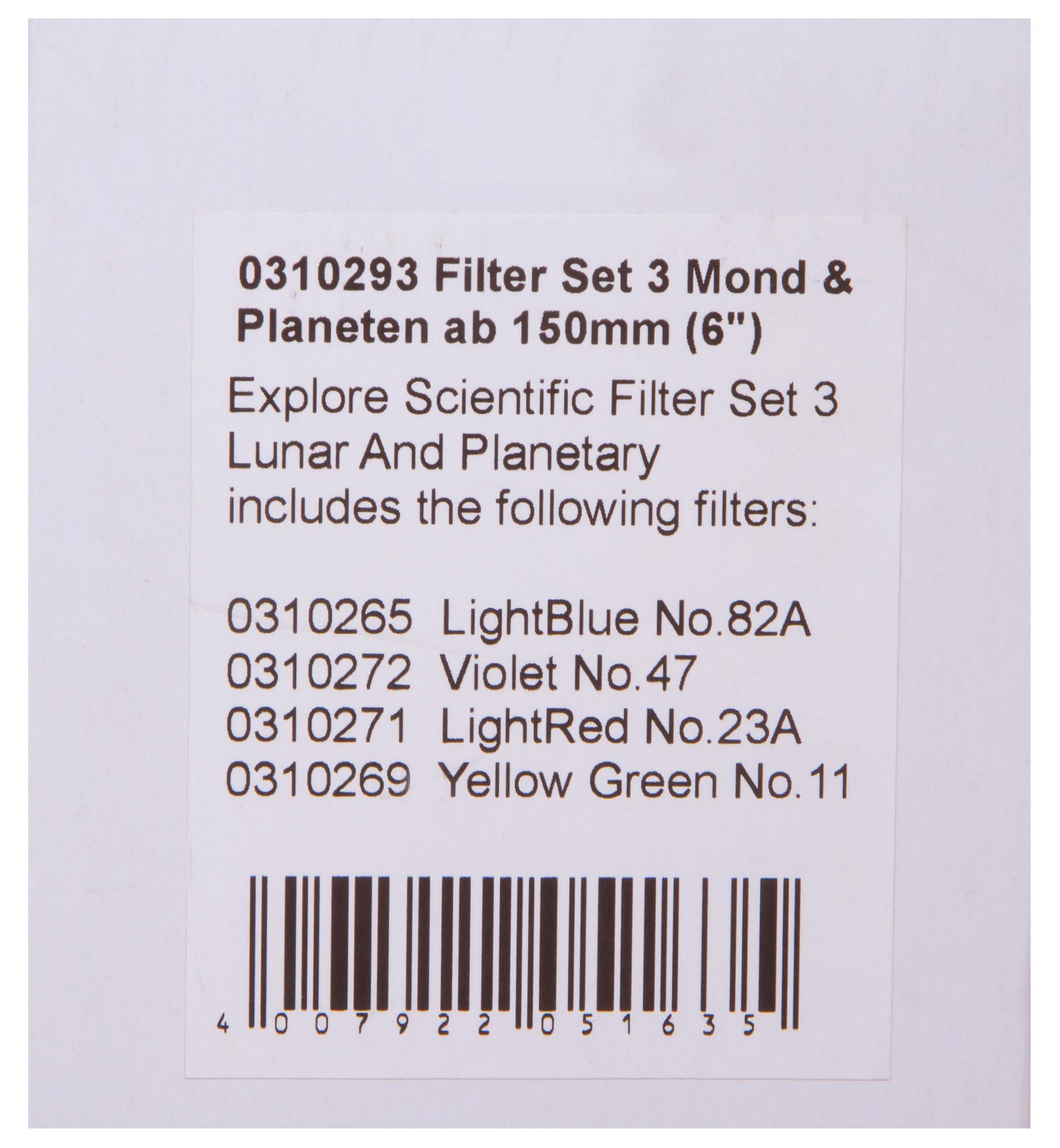 Набор Explore Scientific №3 включает четыре светофильтра для изучения Луны и планет Солнечной системы. Они увеличивают контраст отдельных деталей на планетных дисках, подчеркивают светотени, позволяют подробнее изучать астрономические объекты. Фильтры из набора рекомендуется использовать с телескопами с апертурой от 150 мм.