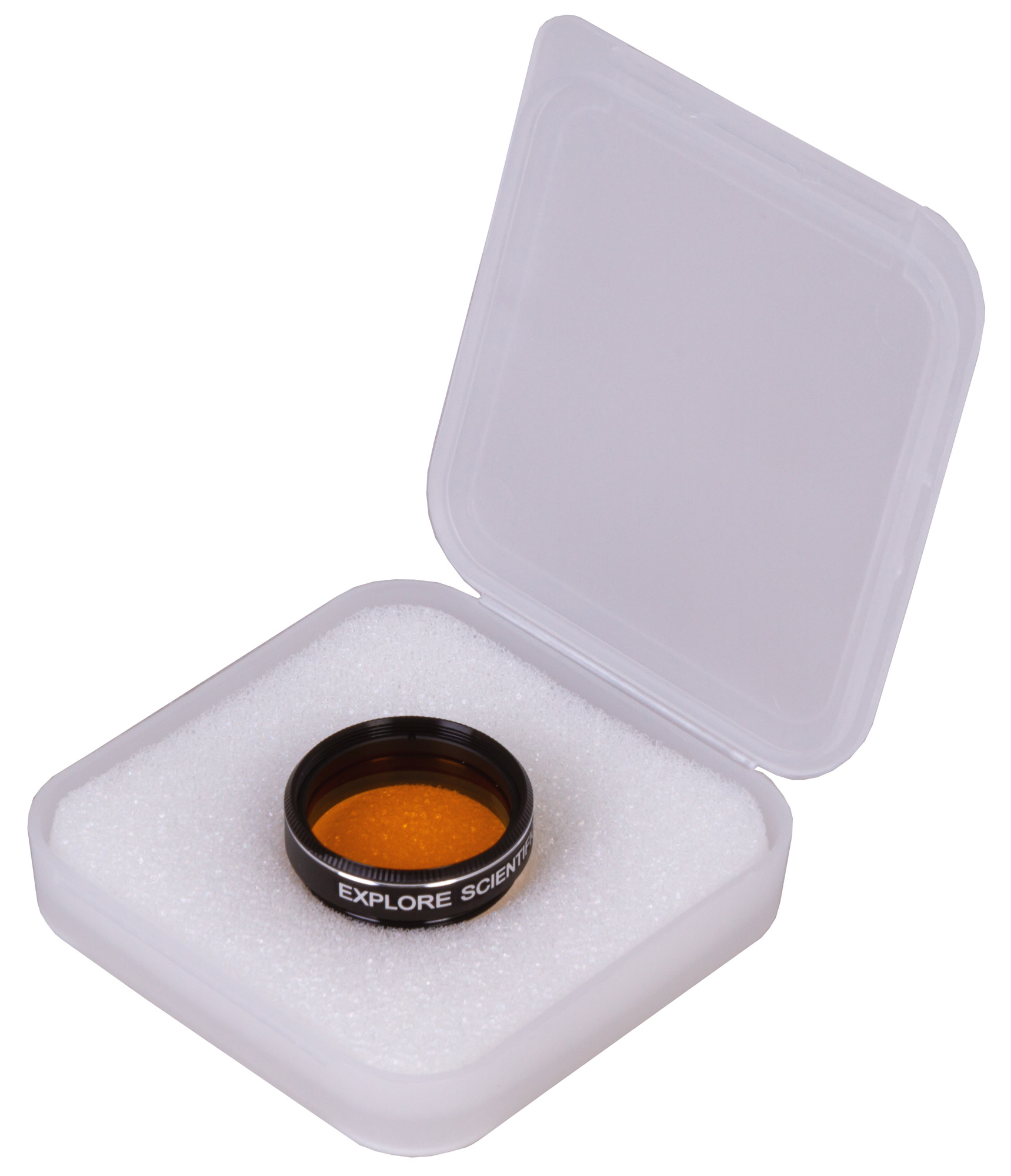 Темно-желтый светофильтр Explore Scientific не только служит для увеличения детализации и контрастности картинки, но и способен снизить проявления хроматизма оптики обычных рефракторов. При изучении Луны разница между сильно освещенными и слабо освещенными областями становится различимой более явно. При наблюдениях Юпитера фильтр полезен для изучения его облачных поясов.