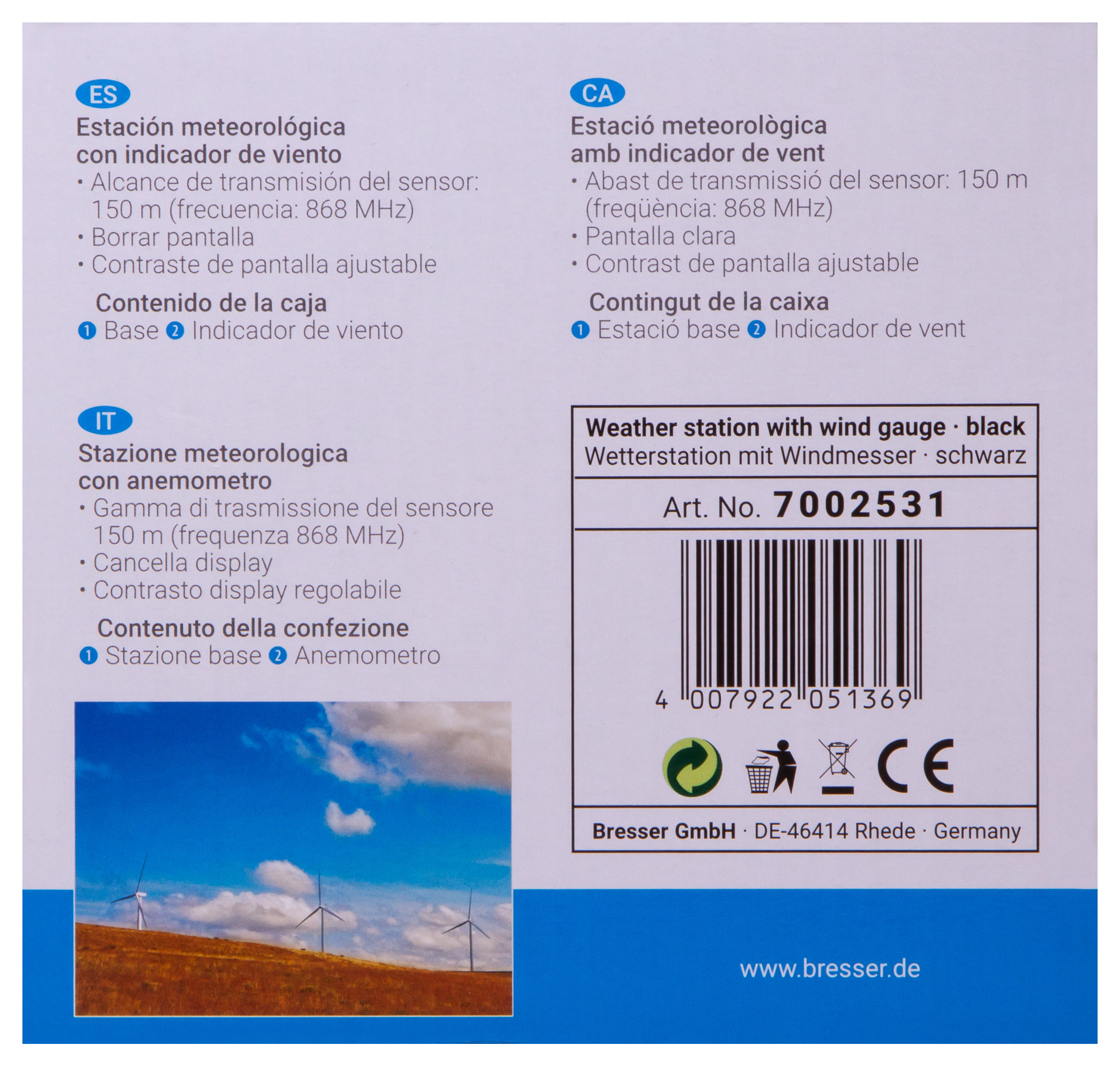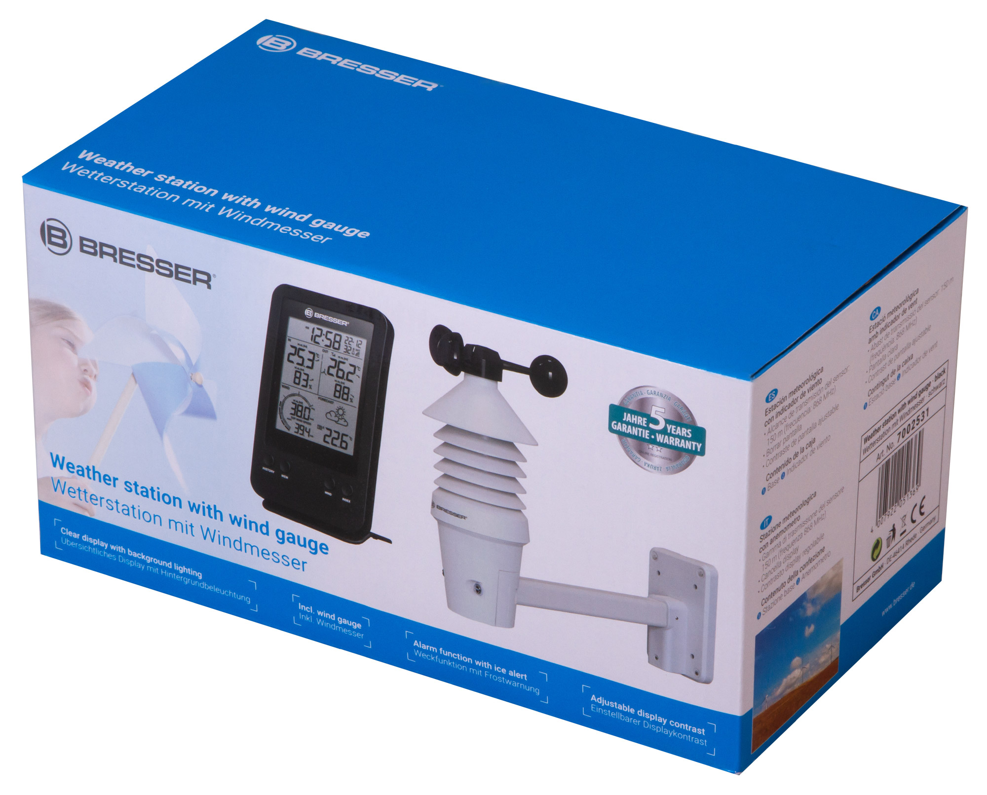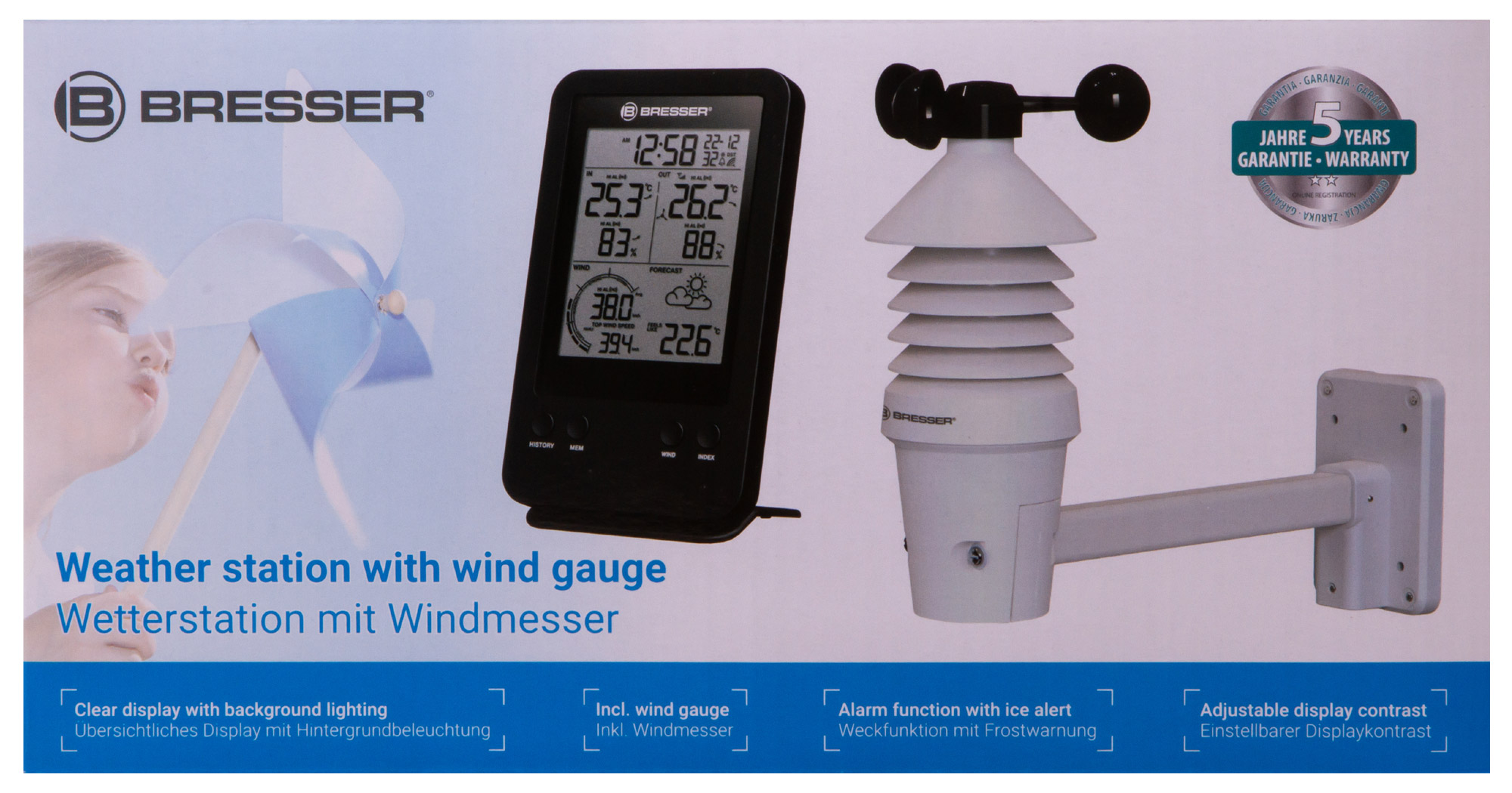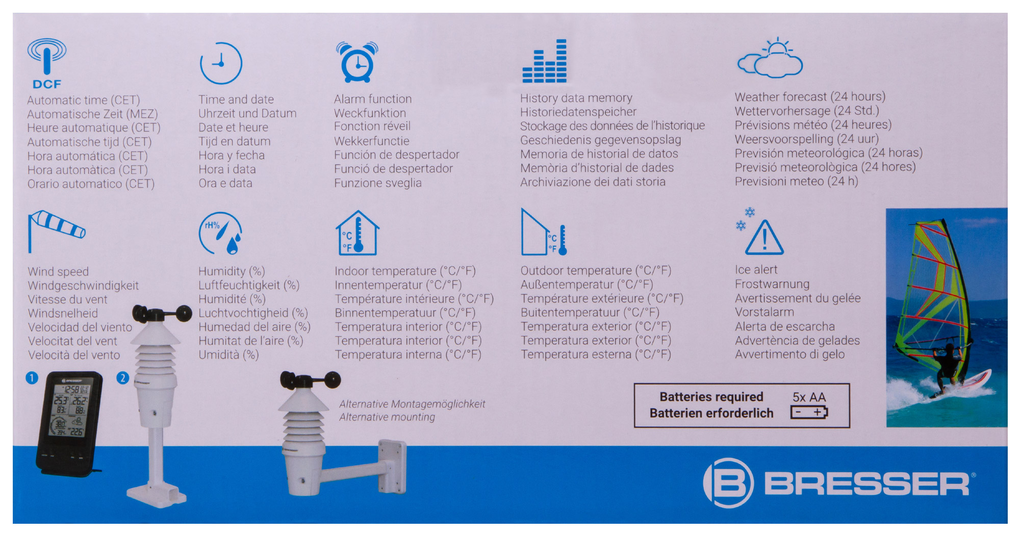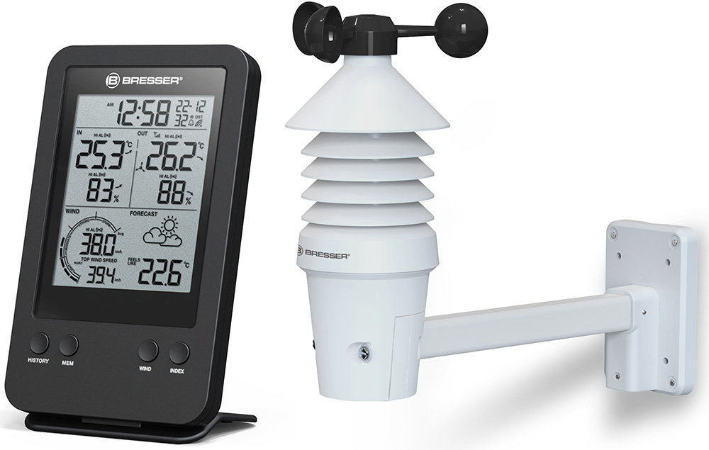 Анемометр (ветромер) Bresser – это профессиональная метеостанция, которая определяет скорость ветра, измеряет температуру и влажность воздуха снаружи и внутри помещения, составляет прогноз погоды на ближайшее время, предупреждает о морозе и шторме, а также показывает время и дату и даже может разбудить на работу. Анемометр (ветромер) Bresser – прибор для тех, кто привык держать капризы погоды под контролем.