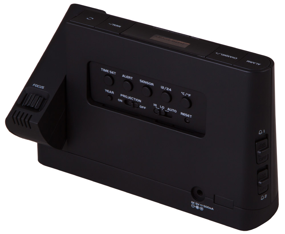 Основная особенность метеостанции – проектор с регулировкой фокуса. Благодаря ему время и температуру можно проецировать на стену или потолок. Эту функцию удобно использовать в слабо освещенных помещениях – в полной темноте индикация видна особенно четко и ярко.