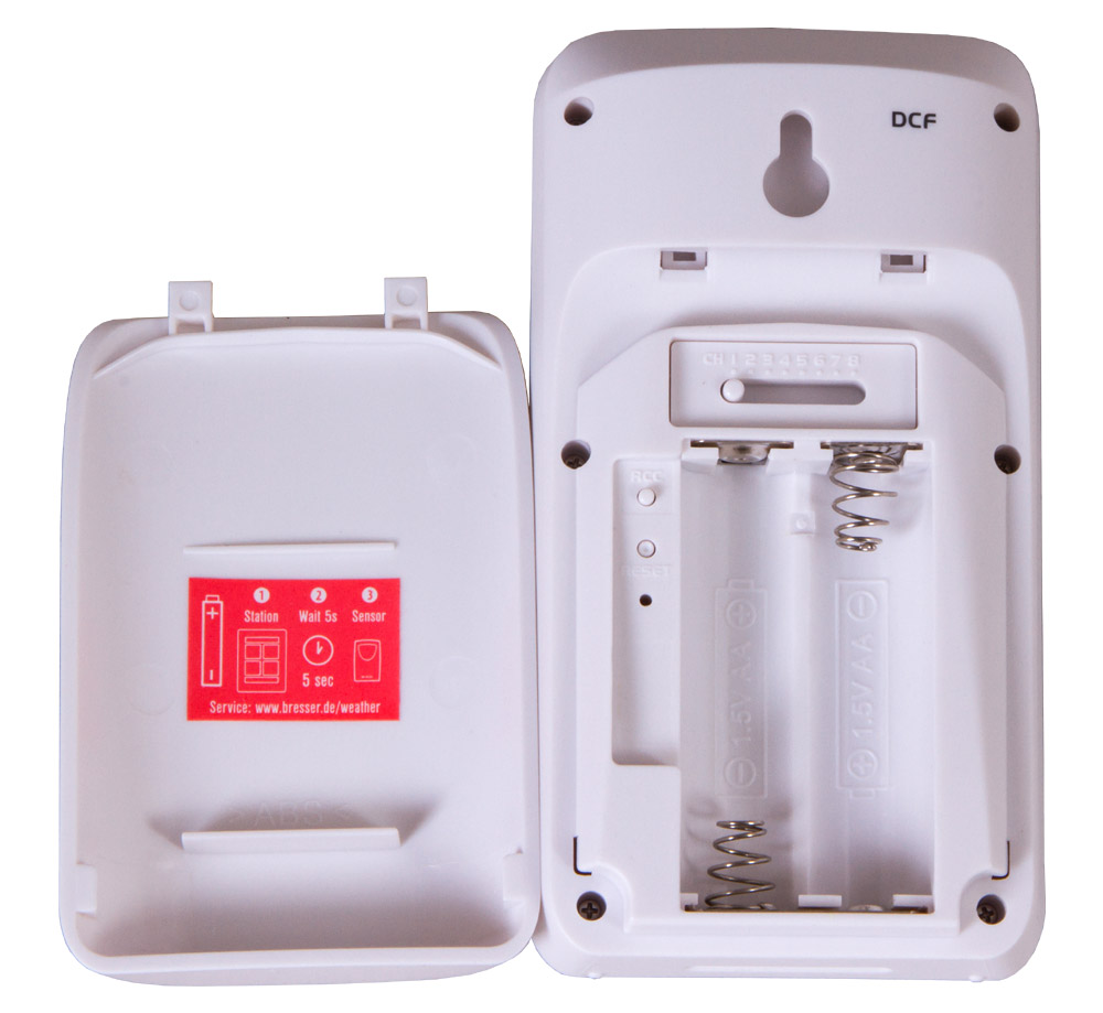На экране кроме текущего времени и действующих будильников отображаются дата и день недели. В левой части можно увидеть и значения внутренней и внешней температуры. Измерения внутри помещения проводит основной модуль, а за измерения на улице отвечает беспроводной наружный датчик. Он передает информацию по радиоканалу на расстоянии до 30 метров. При необходимости к метеостанции можно подключить до 8-ми таких датчиков (приобретаются отдельно).