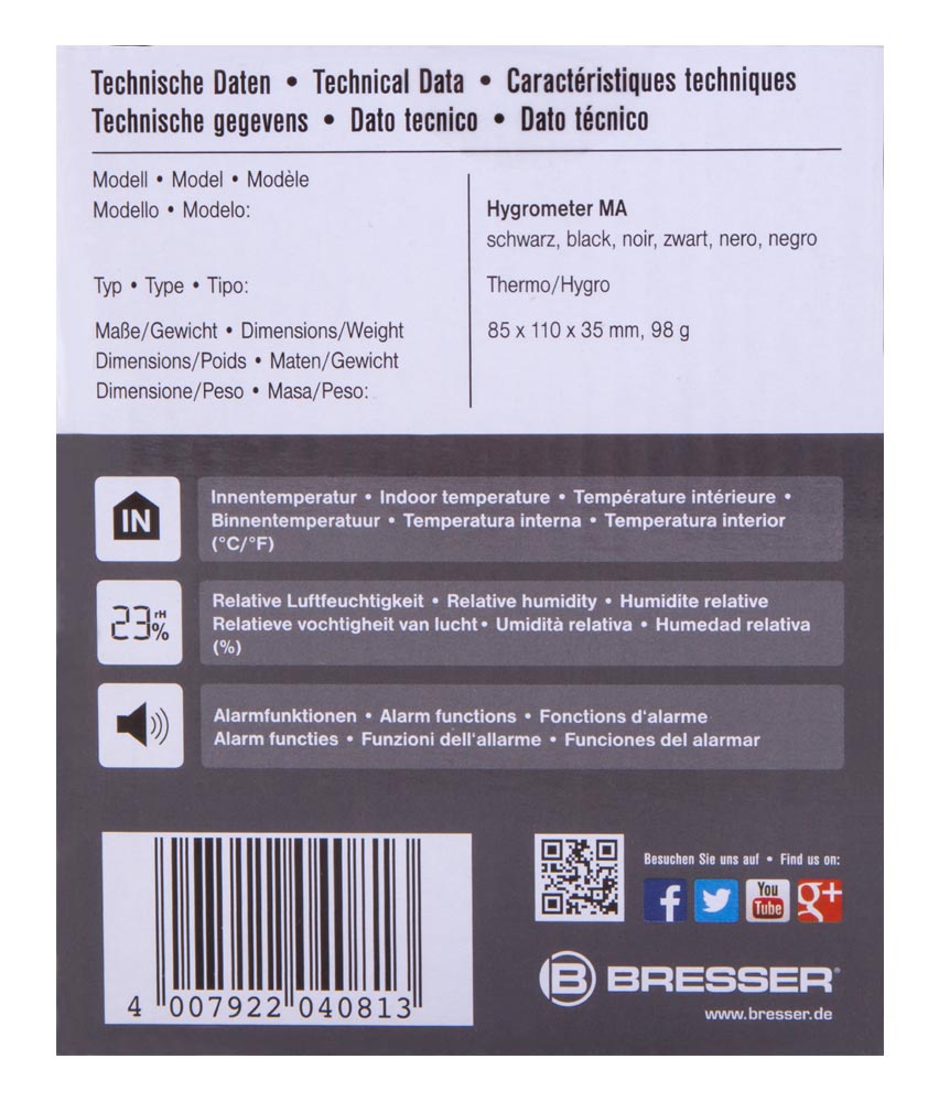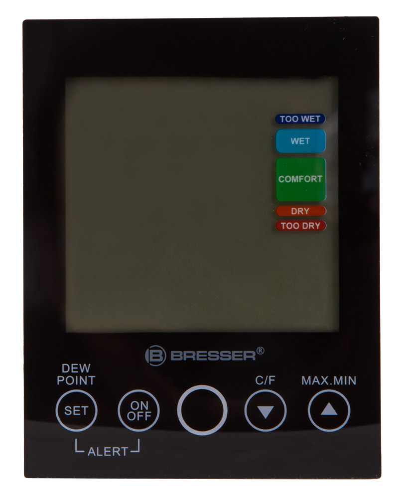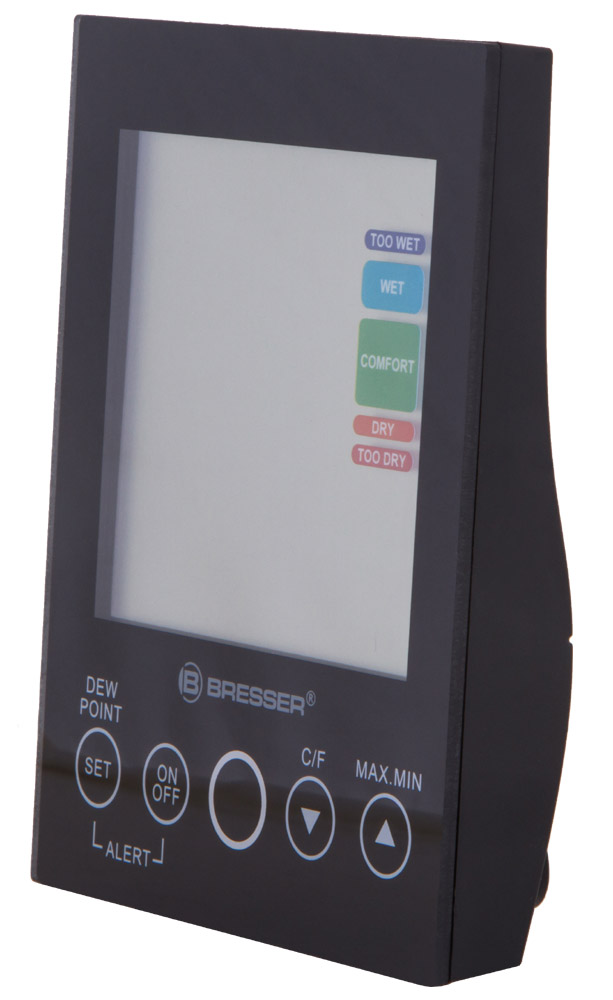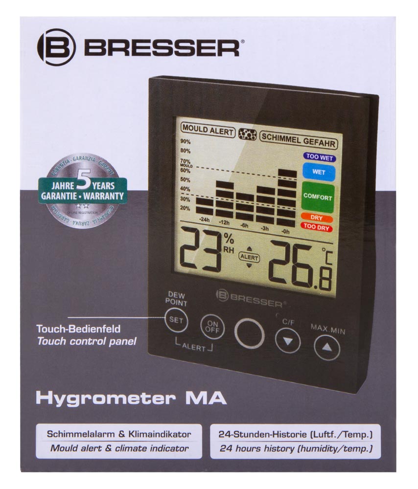 Bresser Mould Alert – компактный гигрометр для квартиры или загородного дома. Он измеряет температуру и влажность воздуха, сообщает звуковым сигналом о негативных изменениях, оценивает уровень общего комфорта в помещении, строит график изменения влажности за последние 24 часа. Гигрометр работает от батареек (нет в комплекте) и устанавливается на небольшую подставку.