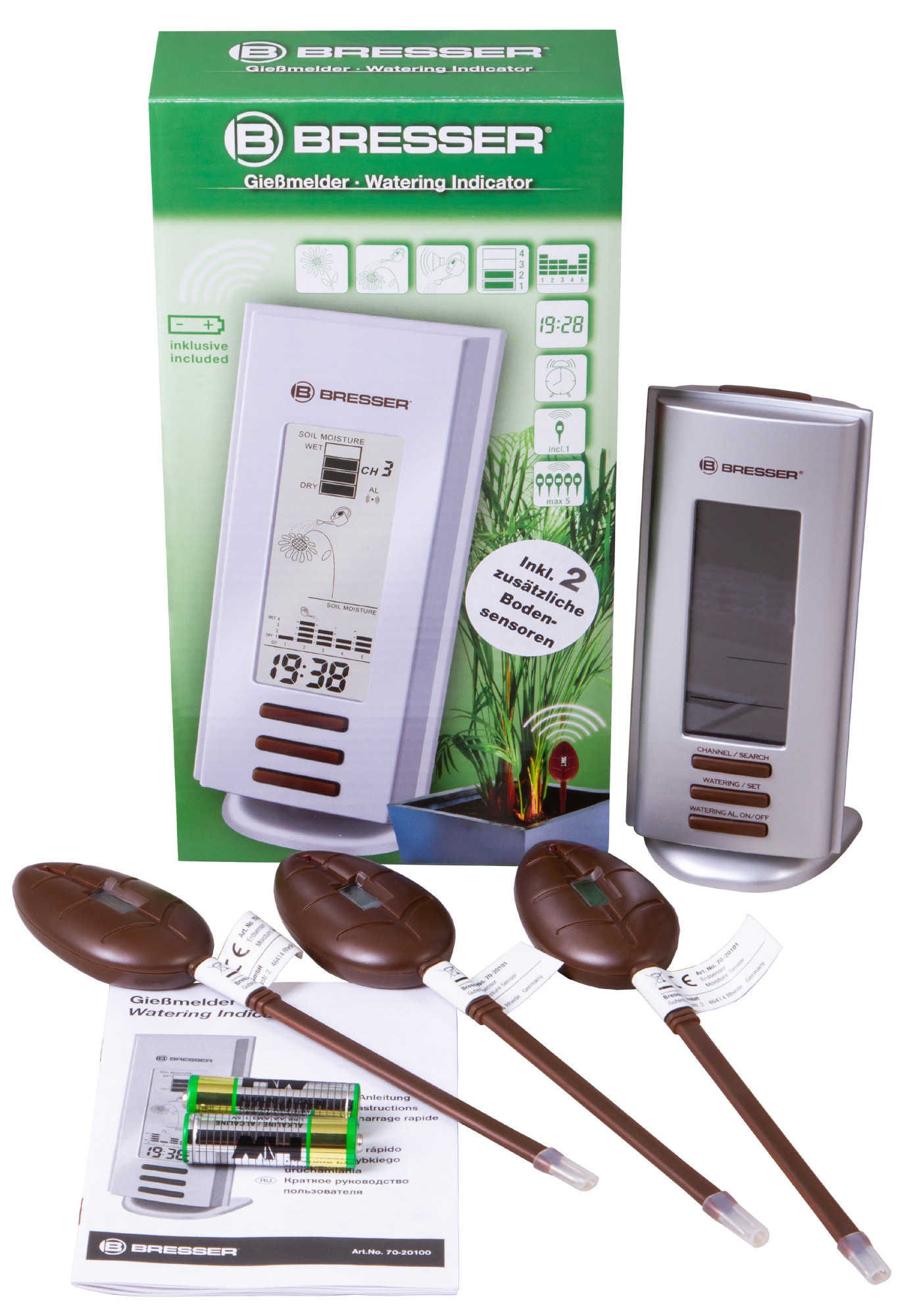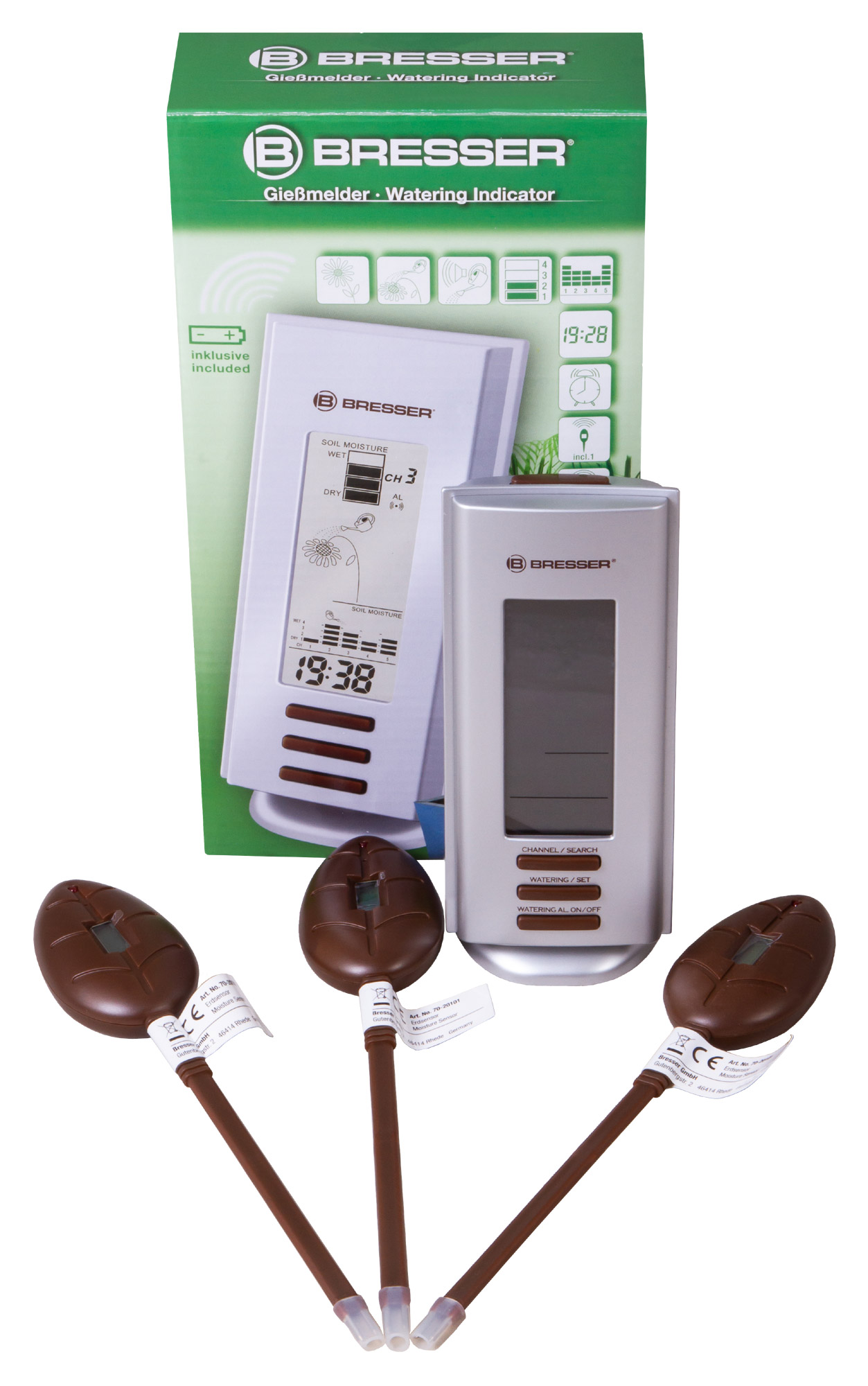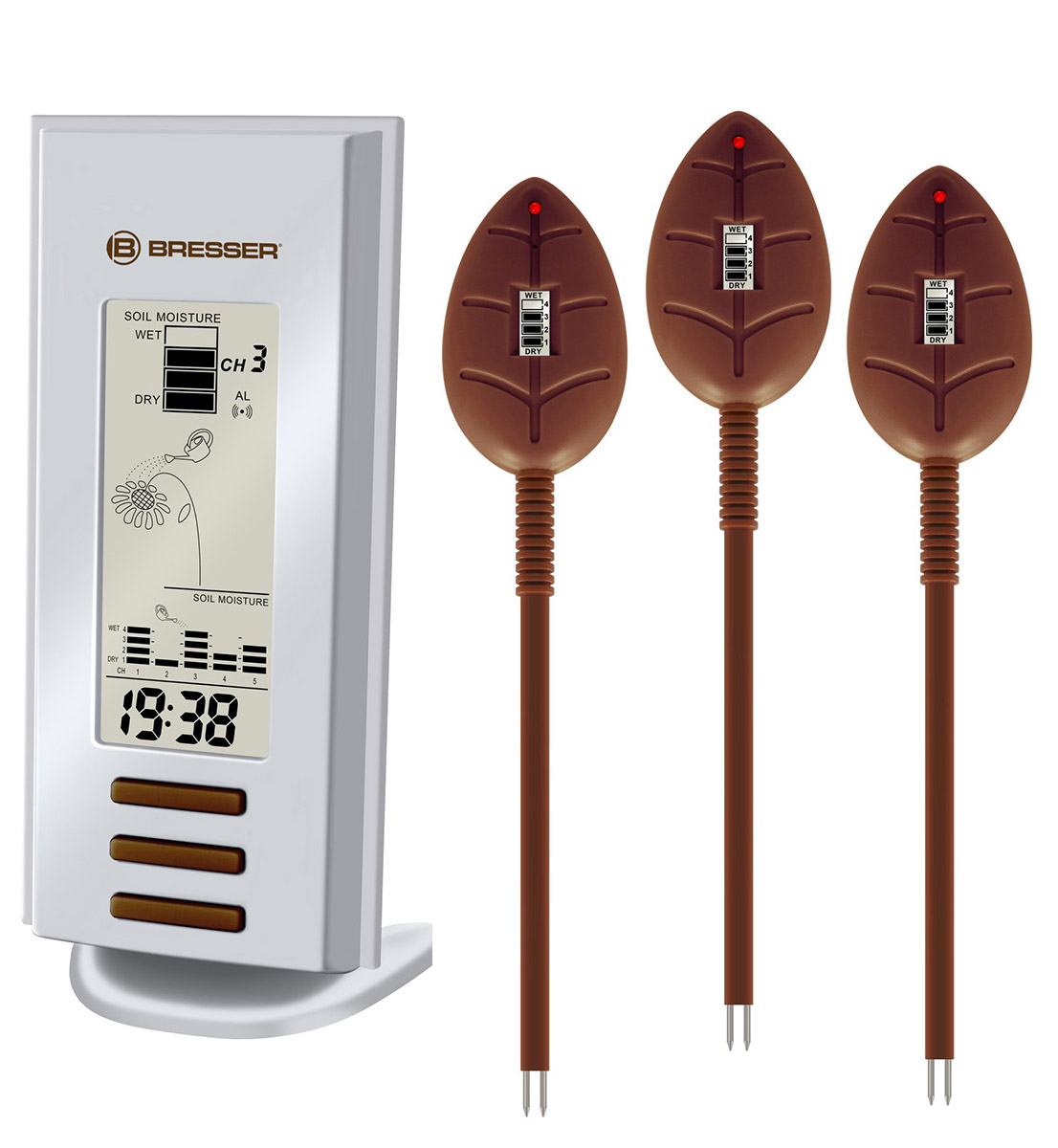 С помощью индикатора полива растений Bresser легко следить за состоянием комнатных цветов и не пропускать время их полива. Прибор состоит из основного модуля с ЖК-экраном и трех наружных датчиков. Датчики устанавливаются в почву, контролируют уровень ее влажности и передают информацию на основной модуль по радиоканалу. Если земля слишком сухая, прибор оповещает об этом звуковым сигналом и визуально на экране. Всего к основному модулю можно подключить до пяти датчиков. Их можно установить на расстоянии до 20 метров от базы.