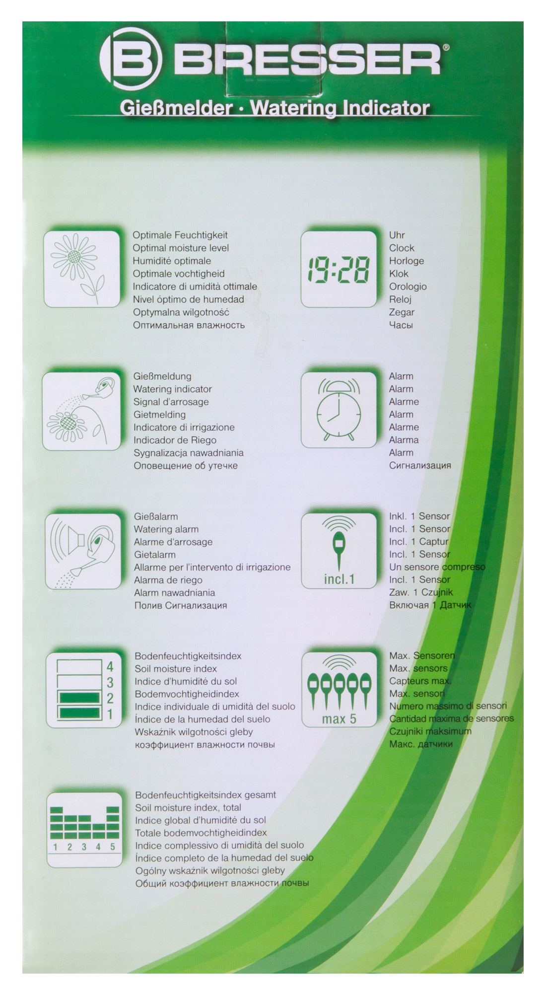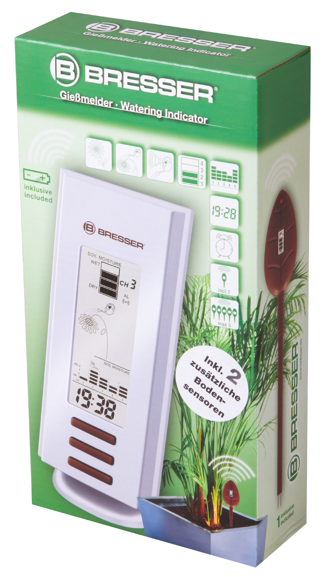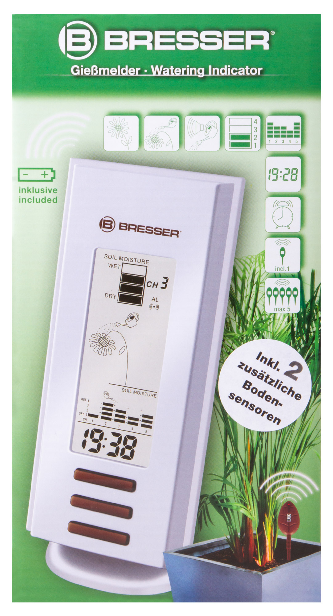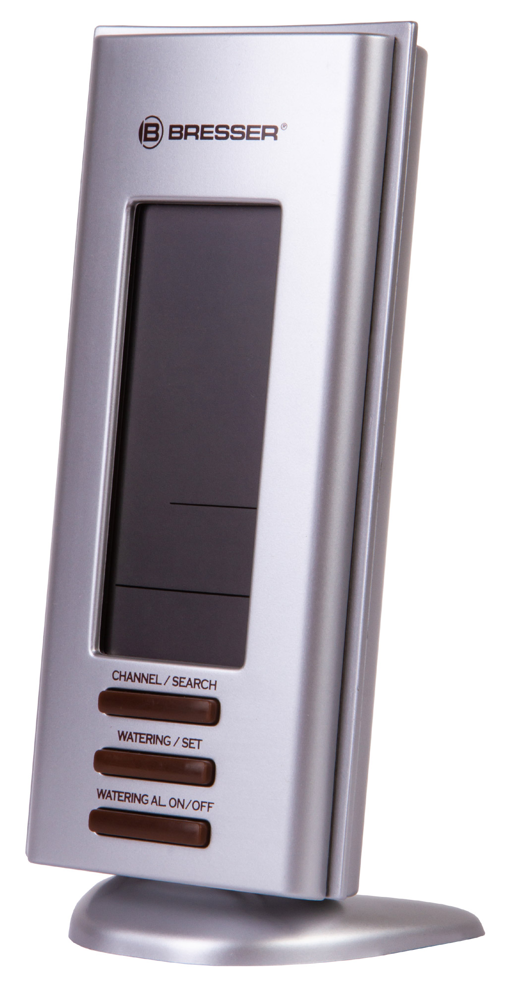 С помощью индикатора полива растений Bresser легко следить за состоянием комнатных цветов и не пропускать время их полива. Прибор состоит из основного модуля с ЖК-экраном и трех наружных датчиков. Датчики устанавливаются в почву, контролируют уровень ее влажности и передают информацию на основной модуль по радиоканалу. Если земля слишком сухая, прибор оповещает об этом звуковым сигналом и визуально на экране. Всего к основному модулю можно подключить до пяти датчиков. Их можно установить на расстоянии до 20 метров от базы.