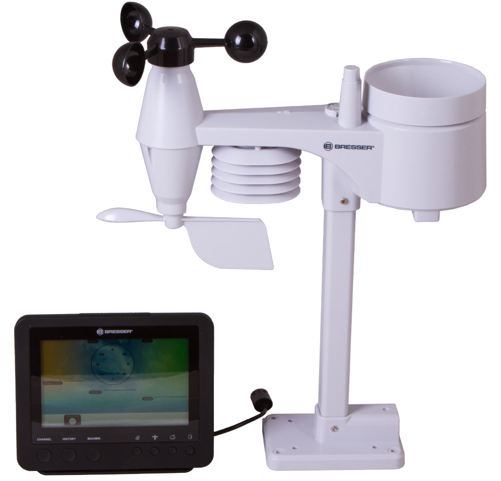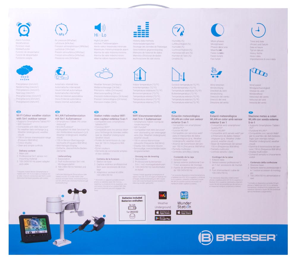 Метеостанция Bresser «5 в 1» Wi-Fi – это профессиональный метеорологический центр с цветным экраном и наружным датчиком, который собирает данные о температуре, влажности воздуха, атмосферном давлении, скорости и направлении ветра, уровне осадков. Кроме того, метеостанция снабжена встроенными часами с будильником и календарем. Bresser «5 в 1» Wi-Fi позволяет следить за капризами погоды и быть в курсе любых изменений в микроклимате дома. Метеостанция отлично подходит для установки в городской квартире или в загородном доме.