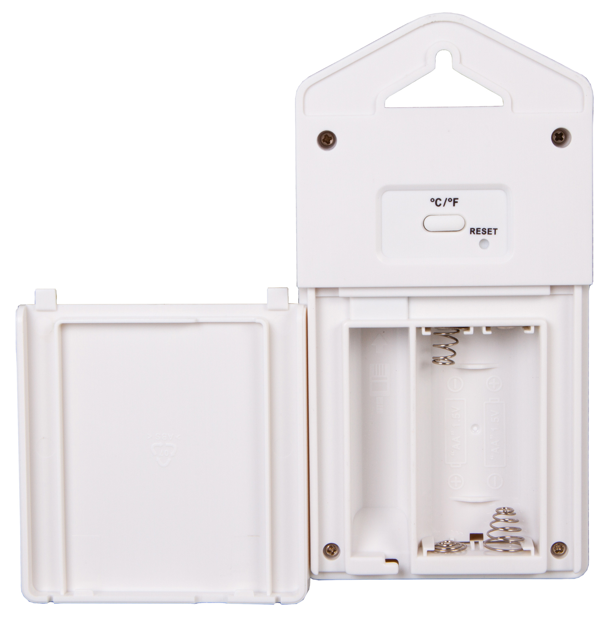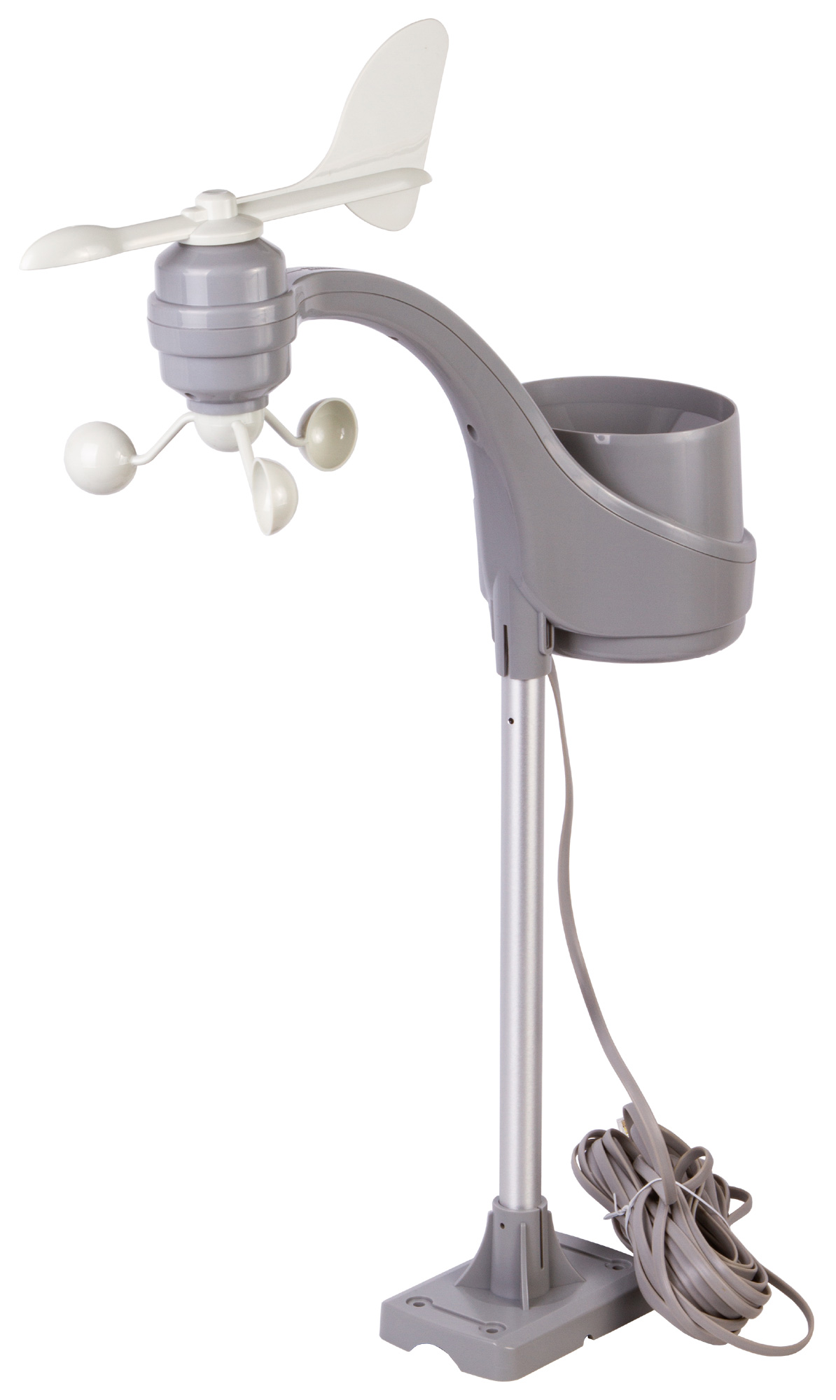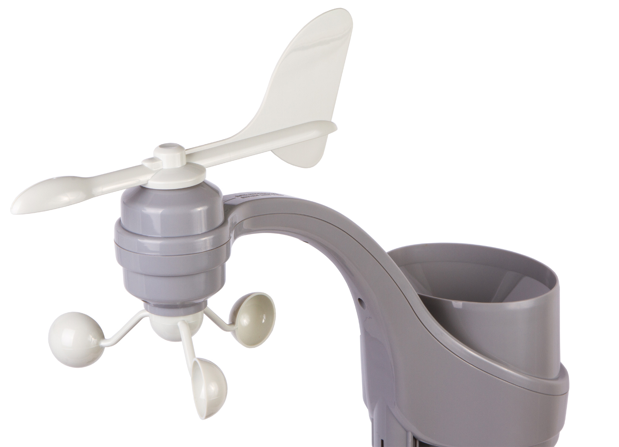 Один из датчиков – это стандартная компактная модель, измеряющая только температуру и влажность воздуха. Для его работы требуются батарейки, данные с датчика на метеостанцию передаются по радиоканалу на расстояние до 80 метров. Второй датчик измеряет скорость ветра, определяет его направление, а также является дождемером. У него нет батарейного отсека, он подключается к термогигродатчику при помощи кабеля (в комплекте, длина кабеля – 9,5 метров). Оба датчика предназначены для установки снаружи помещения.