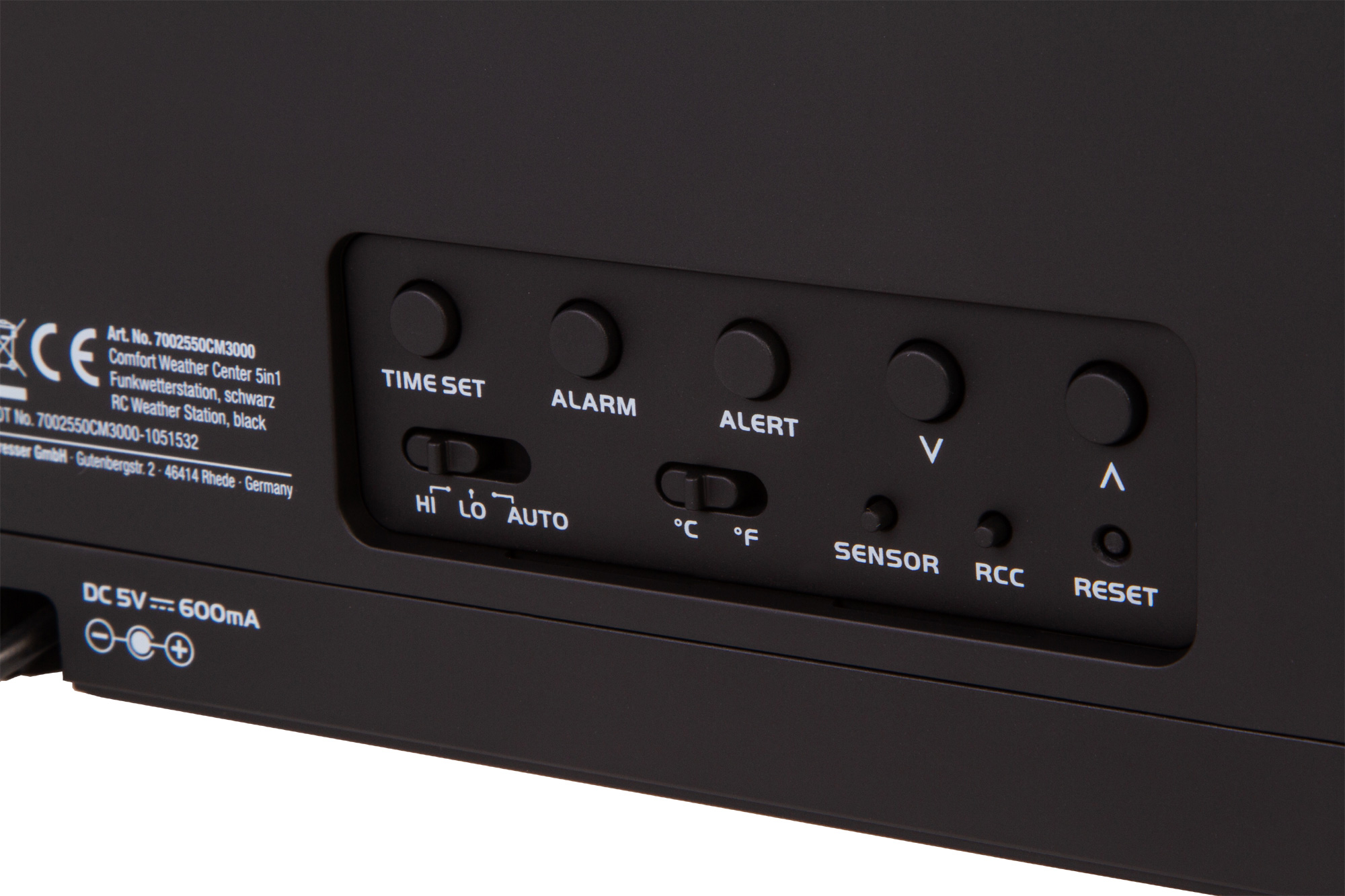Кнопки управления метеостанцией находятся на задней крышке. Для питания используется сеть переменного тока (основной модуль) и батарейки (датчик).