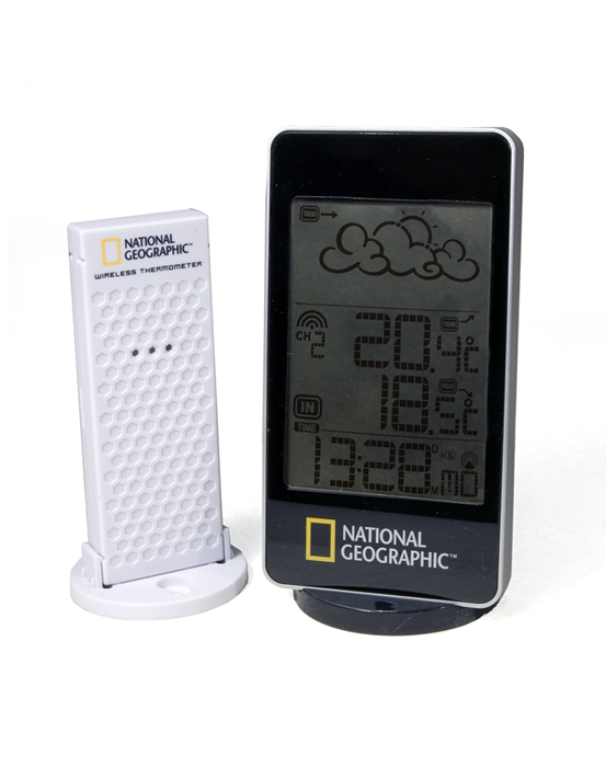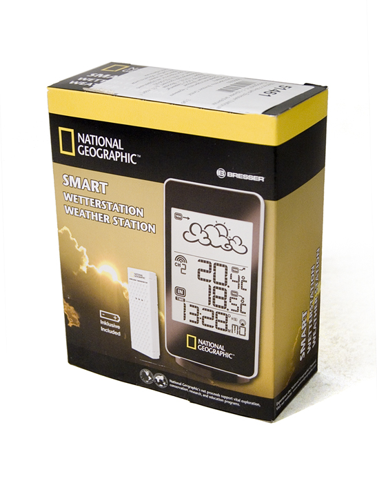 Метеостанция Bresser National Geographic имеет ЖК-экран, визуально разделенный на три блока. Прибор устанавливается на специальную подставку, входящую в комплект. Внешний датчик работает от 2х батареек, а взаимодействие со станцией происходит по беспроводному соединению. Метеостанция показывает информацию о комнатной и/или уличной температуре по трем точкам, отображает специальные погодные символы: ясно, переменная облачность, облачно, дождь, ливень, снег, метель. В прибор включена функция программируемого предупреждения о возможной гололедице на дорогах, об излишне высокой или низкой температуре. Многофункциональная модель также имеет функцию будильника и часов. В комплект входит: основной блок настольная подставка внешний одноканальный датчик элементы питания инструкция по эксплуатации и гарантийный талон