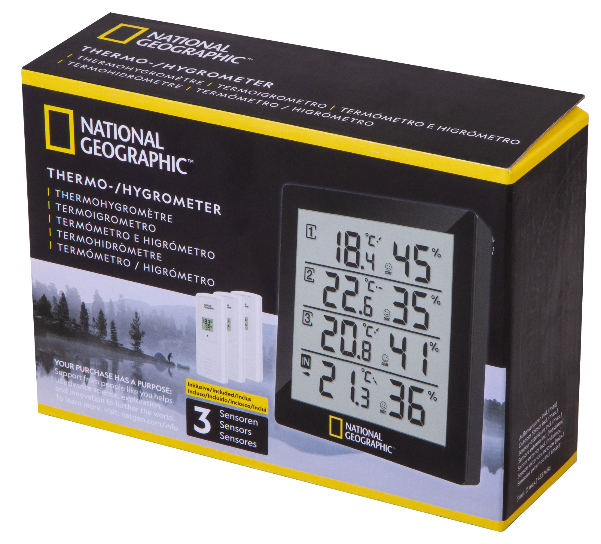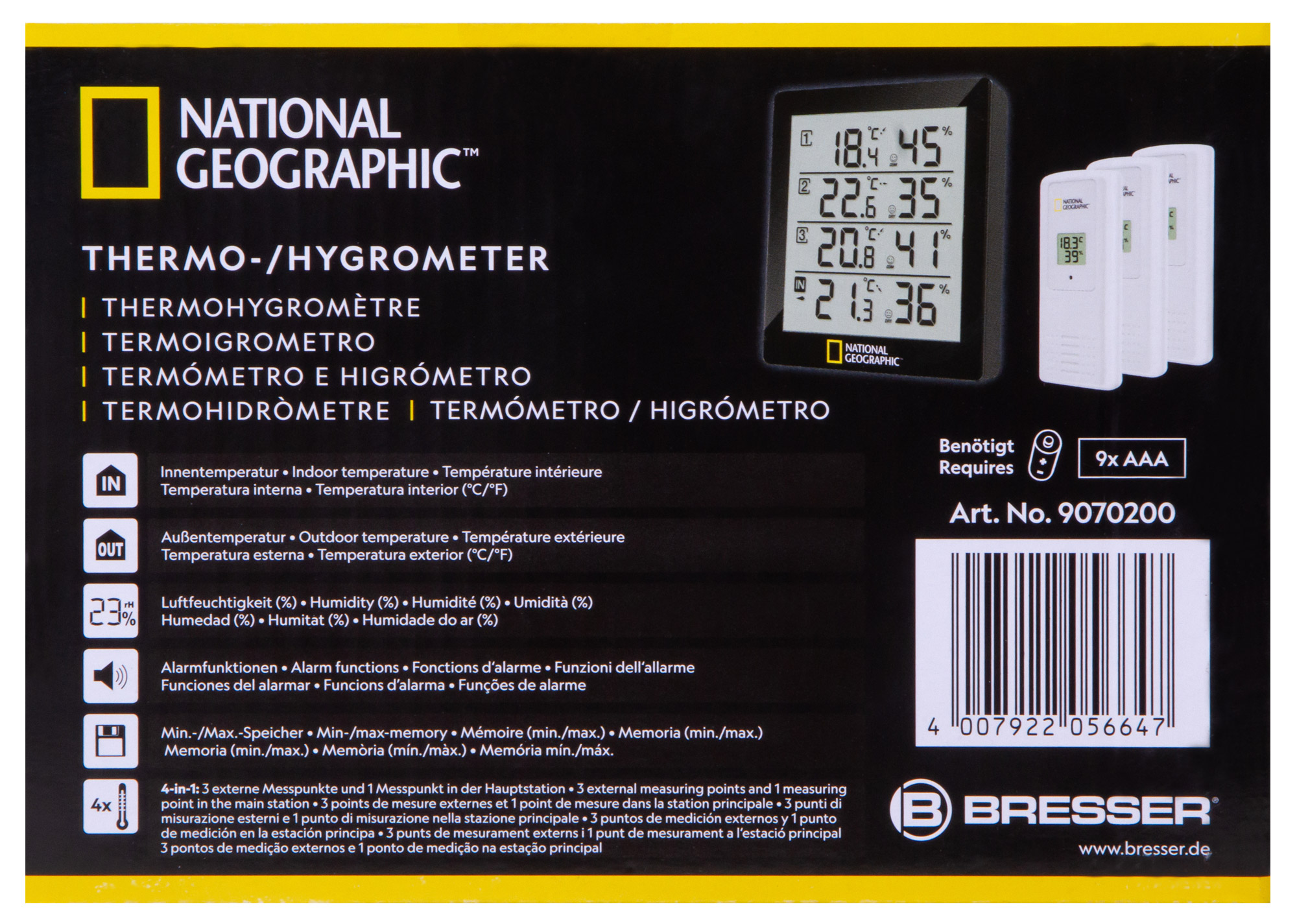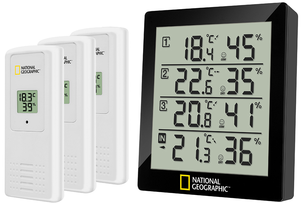 Термогигрометр Bresser National Geographic комплектуется тремя дополнительными радиодатчиками, поэтому способен проводить измерения температуры и влажности воздуха в четырех местах одновременно. Все показания отображаются на встроенном экране крупно и четко. Кроме того, на нем показывается и индикатор общего уровня комфорта: небольшой смайлик улыбается, когда все хорошо, и расстраивается, когда метеоусловия неблагоприятны.