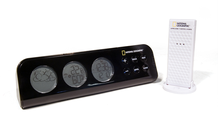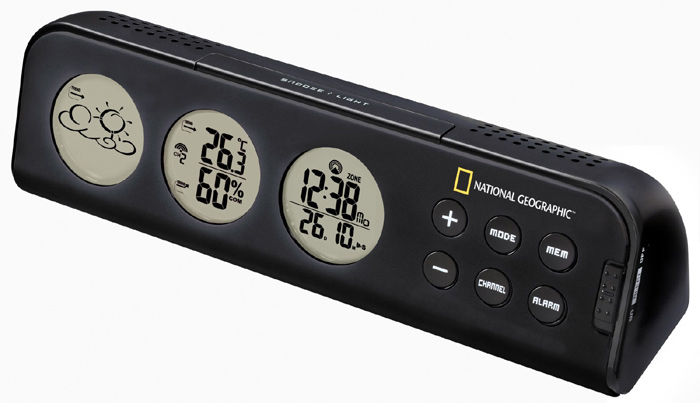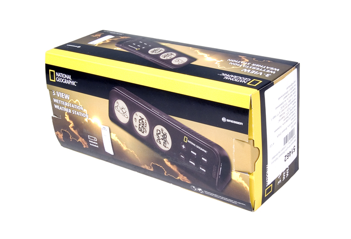 Метеостанция Bresser National Geographic в горизонтальном корпусе оборудована тремя ЖК-экранами, на которых отображается подробная информация о погоде, температуре и влажности, дата и время. В прибор встроена функция программируемого предупреждения о возможной гололедице на дорогах, а также об излишне высокой или низкой температуре. Модель имеет функцию будильника и отображает время. В комплект поставки входит метеостанция, внешний блок, инструкция по эксплуатации и гарантийный талон.