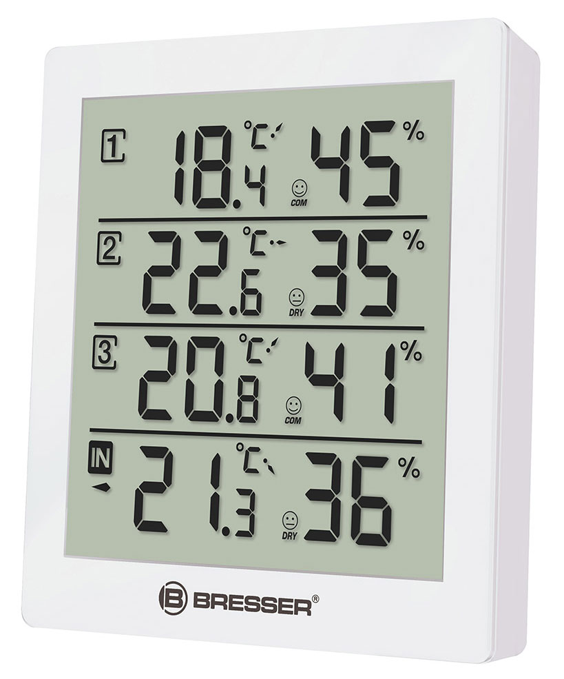 Метеостанция Bresser Temeo Hygro Quadro отлично подходит для домашнего использования. Она измеряет влажность воздуха и температуру и делает это сразу в нескольких местах одновременно. Основной модуль отвечает за измерения внутри помещения, а три наружных датчика можно установить в доме или на улице на удалении до 30 метров от метеостанции. Датчики защищены от брызг, не требуют проводного подключения.