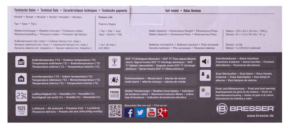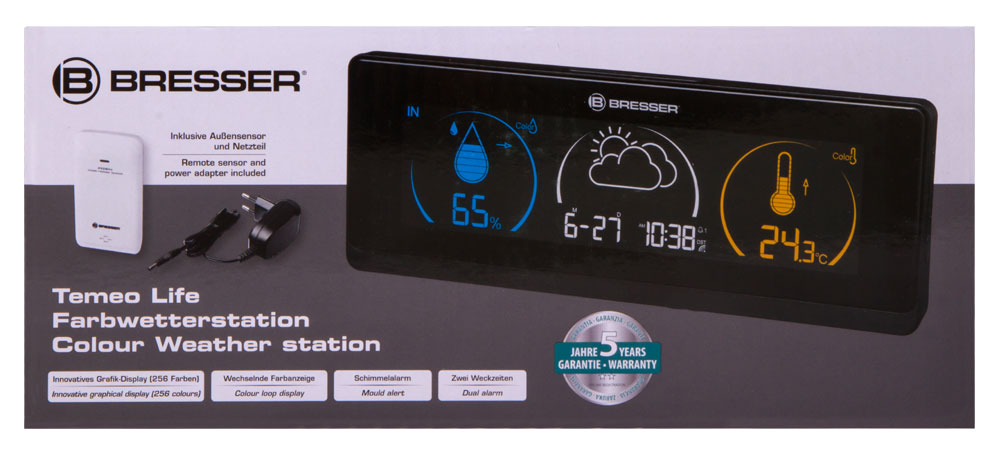 Bresser Temeo Life – метеостанция с наружным датчиком, которая измеряет температуру и влажность воздуха на улице и в помещении. В ней также есть встроенные часы, будильник и календарь. Метеостанция станет отличным подарком себе или близкому человеку и поможет следить за изменениями погоды.