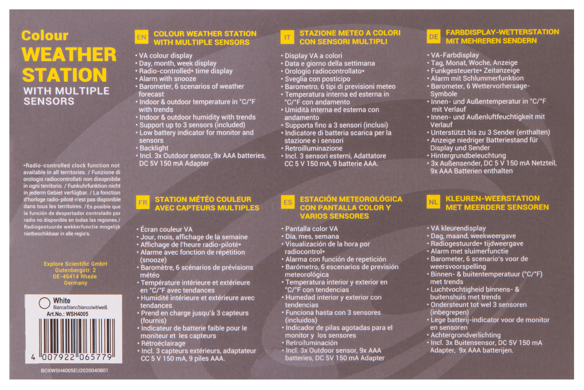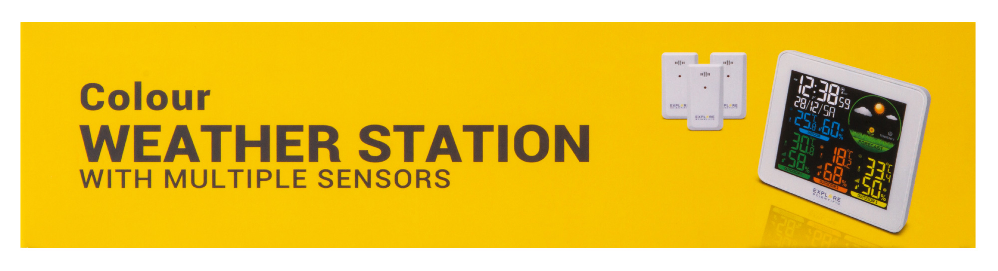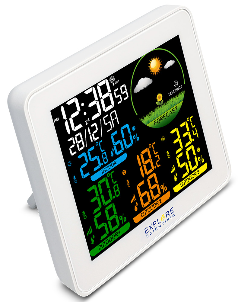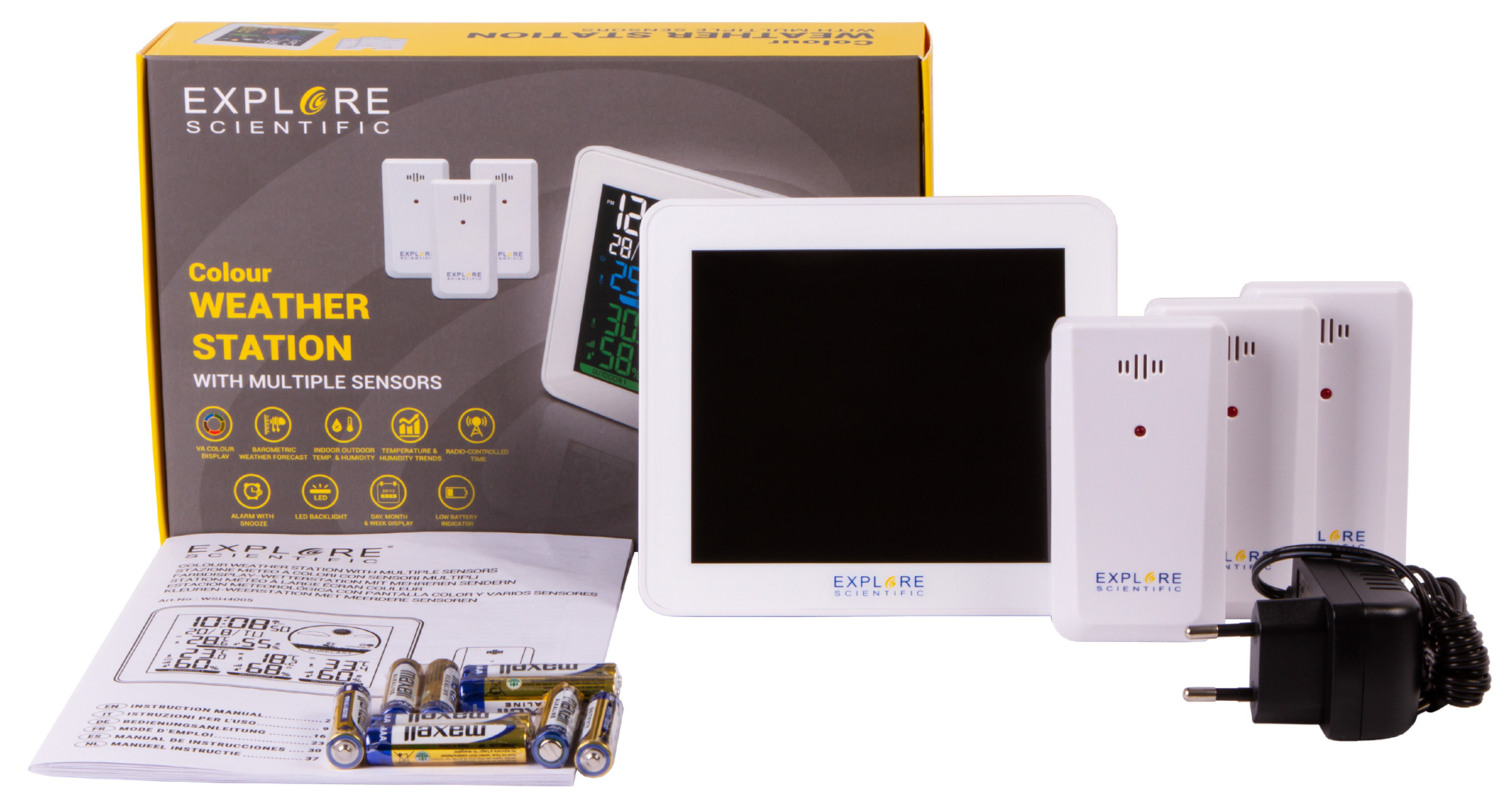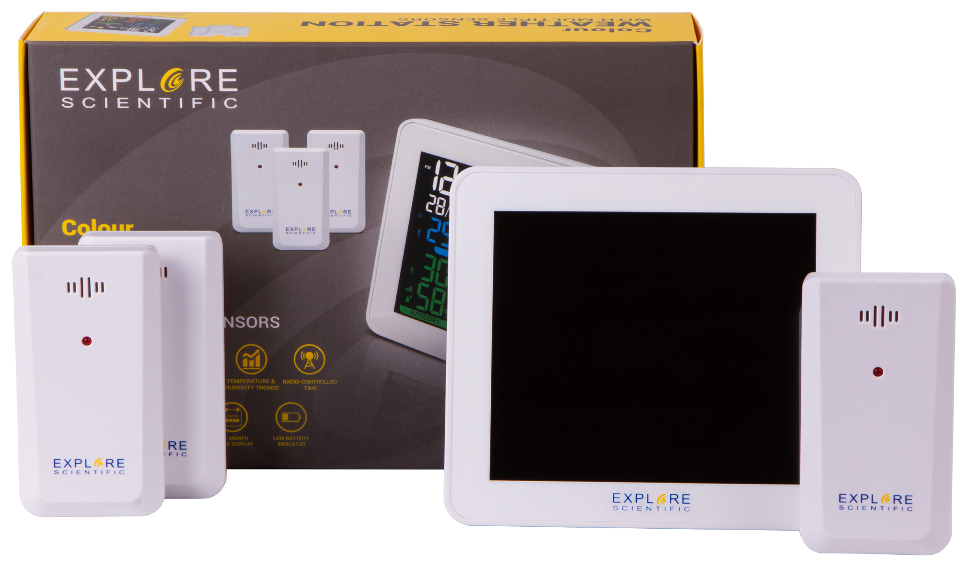 Метеостанция Explore Scientific с цветным экраном и тремя датчиками, белая