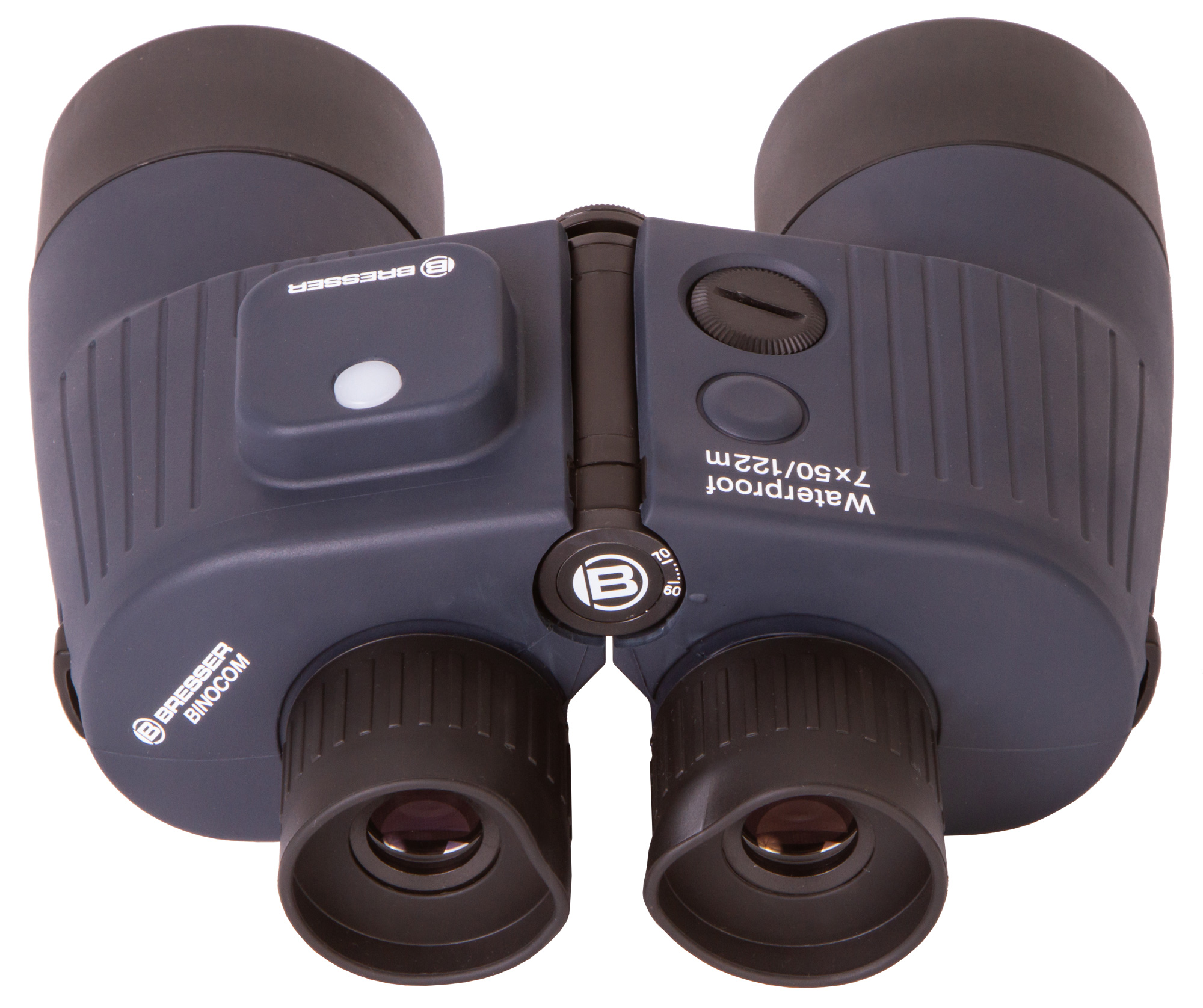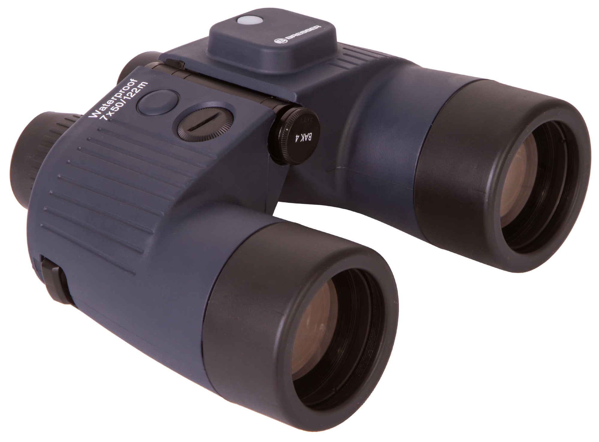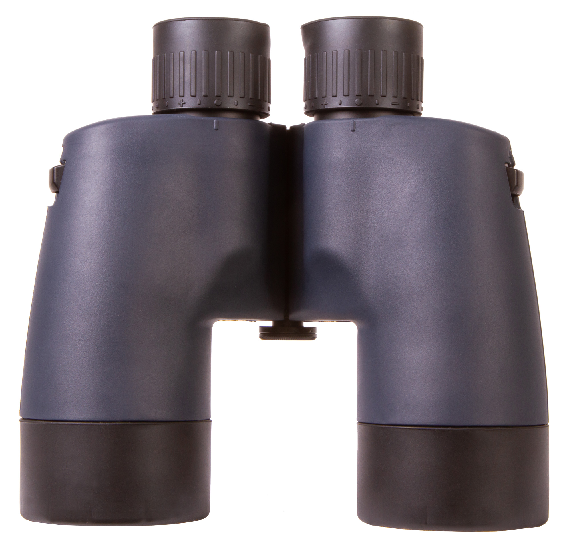 В бинокле используются классические Porro-призмы, оптические элементы сделаны из стекла BaK-4 и просветлены несколькими слоями специального покрытия. Диаметр объективов составляет 50 мм, поэтому оптика хорошо собирает свет, что позволяет использовать бинокль даже в сумерках. Увеличение бинокля – 7 крат, это стандартная кратность для морских моделей. Для каждого окуляра резкость картинки настраивается индивидуально – это очень удобно при неидеальном зрении. Для носящих очки важной опцией будет наличие поворотно-выдвижных наглазников.