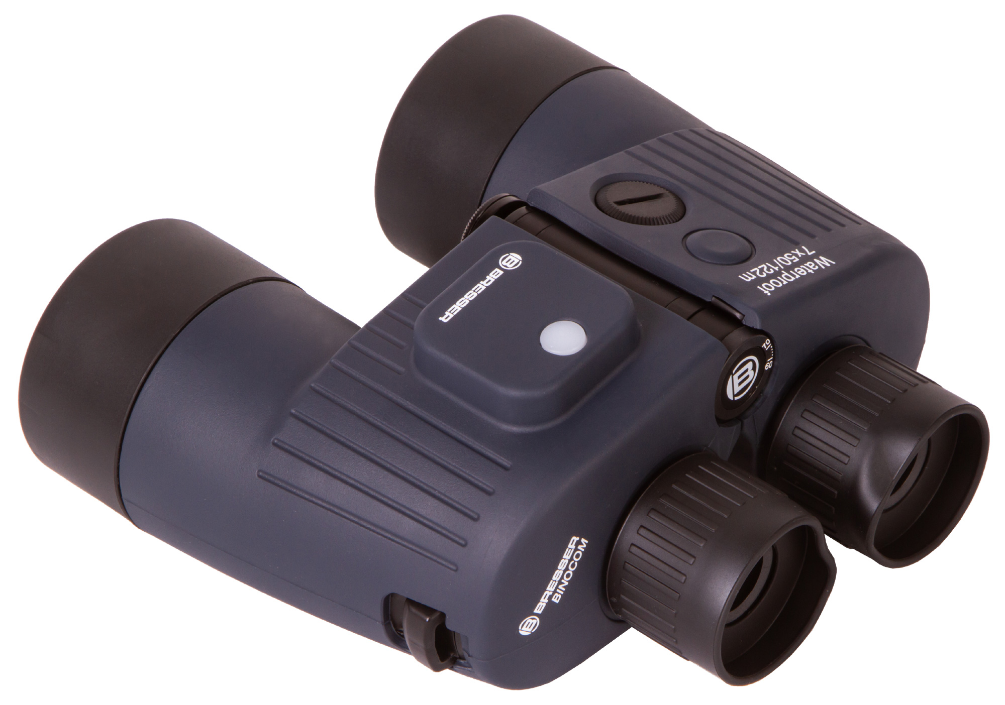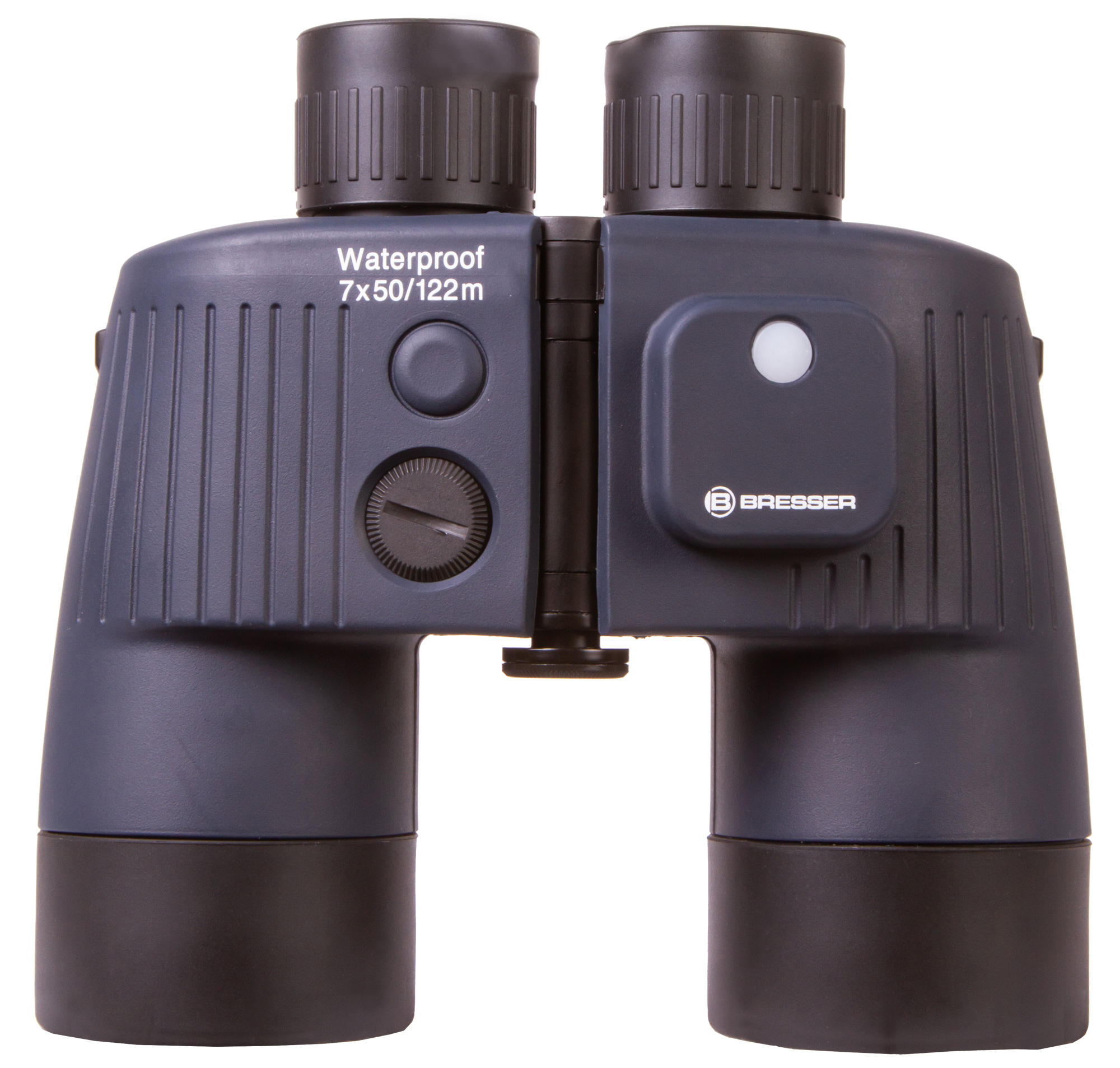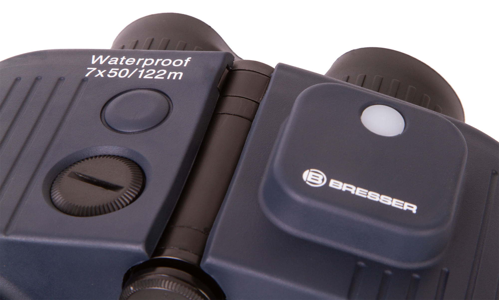 В бинокле используются классические Porro-призмы, оптические элементы сделаны из стекла BaK-4 и просветлены несколькими слоями специального покрытия. Диаметр объективов составляет 50 мм, поэтому оптика хорошо собирает свет, что позволяет использовать бинокль даже в сумерках. Увеличение бинокля – 7 крат, это стандартная кратность для морских моделей. Для каждого окуляра резкость картинки настраивается индивидуально – это очень удобно при неидеальном зрении. Для носящих очки важной опцией будет наличие поворотно-выдвижных наглазников.