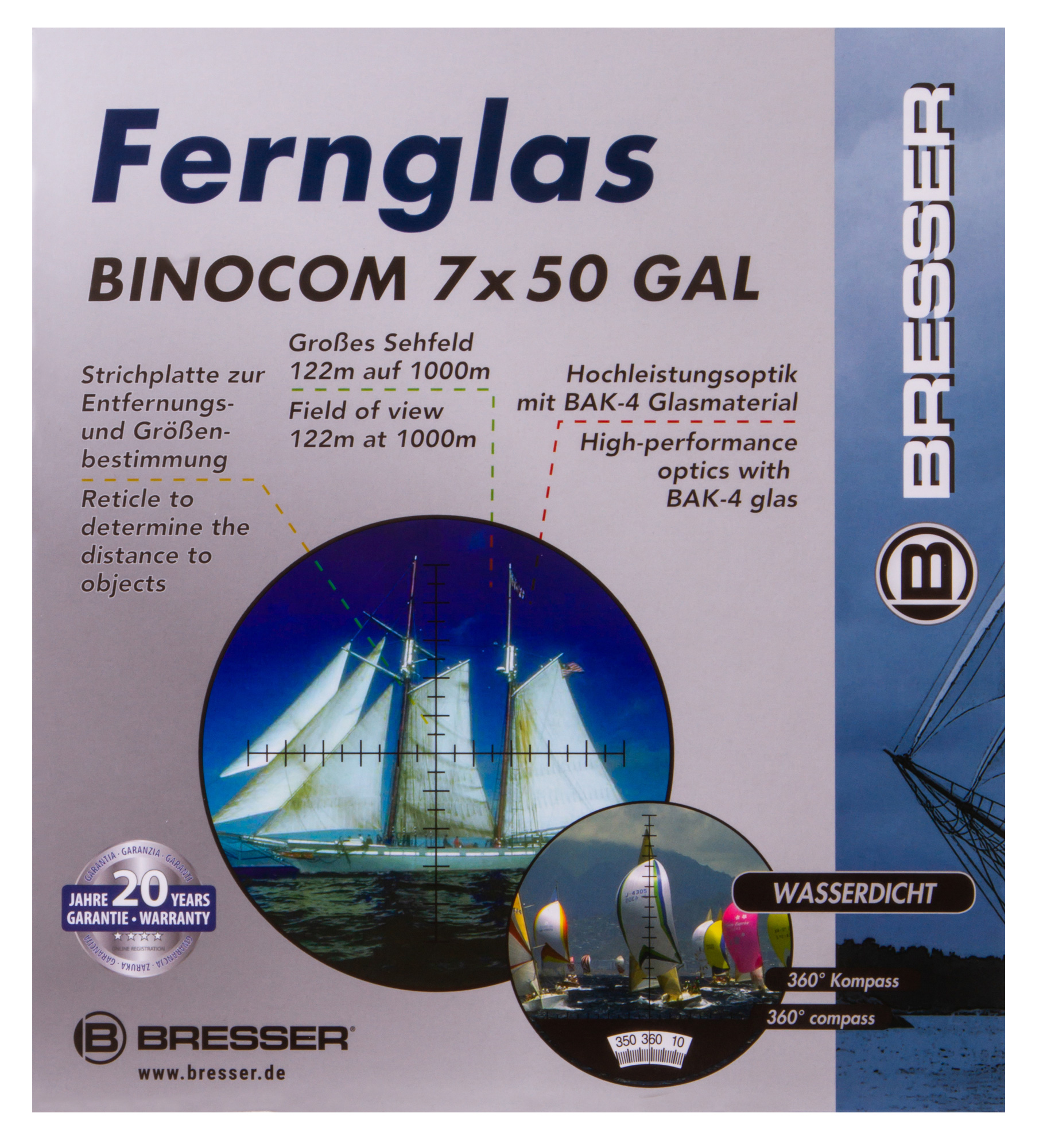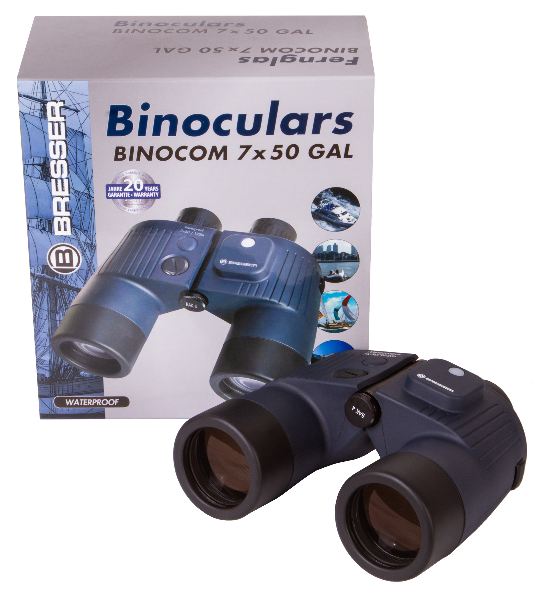 Бинокль Bresser Binocom 7x50 GAL хорошо проявит себя в полевых наблюдениях и в наблюдениях вблизи воды. Это герметичный, полностью водозащищенный и азотозаполненный бинокль со стеклянной просветленной оптикой. Также в нем есть встроенный компас и измерительная шкала для определения расстояния до объекта и его высоты. Кроме того, в комплекте идет специальный плавающий ремень: если бинокль случайно упадет в воду, он не даст ему затонуть и укажет на место, где искать пропажу.
