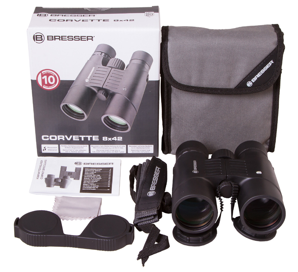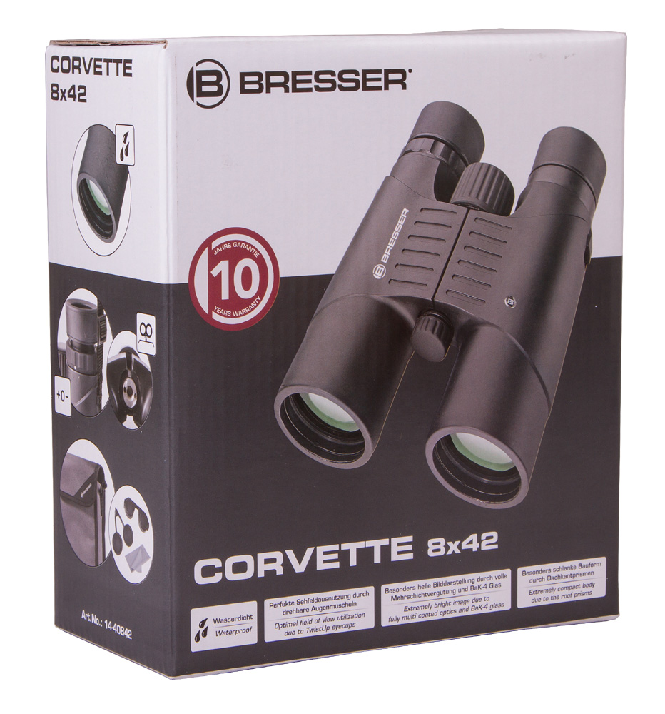 Прочный и влагостойкий бинокль Bresser Corvette 8x42 основан на системе призм roof (с крышей). При увеличении 8 крат и диаметре объективов 42 мм прибор имеет широкое поле зрения и минимальное расстояние фокусировки 5 м. Оптическое стекло BаK-4 с многослойным просветлением гарантирует получение качественного и яркого изображения без искажений. Пользователь бинокля может корректировать межокулярное расстояние и диоптрии, а также вести наблюдения в очках. Прибор снабжен системой центральной фокусировки. Благодаря азотному заполнению обрезиненного корпуса оптика защищена от запотевания, что, безусловно, важно в условиях резких перепадов температур. В комплекте футляр для хранения и переноски, крышки объективов и окуляров.
