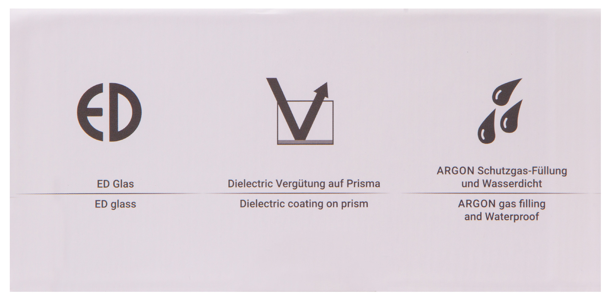 В бинокле используются roof-призмы с фазовым покрытием, которое улучшает цветопередачу, контраст и разрешение изображения. Оптические элементы сделаны из низкодисперсионного ED-стекла, поэтому искажения сведены к минимуму, а мелкие детали видны намного четче. Оптика дополнена двумя покрытиями: просветляющим и диэлектрическим. Оба увеличивают эффективность бинокля при использовании в условиях слабой освещенности.