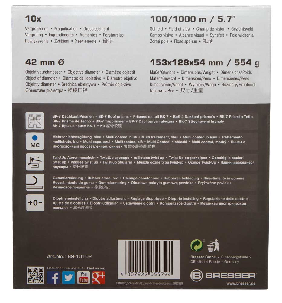 Бинокль Bresser S-Series 10x42 легко адаптируется под нужды наблюдателя. Окуляры с вынесенным зрачком и поворотно-выдвижные наглазники позволяют вести наблюдения в очках. Диоптрийная коррекция на правом окуляре дает возможность откорректировать оптику под особенности зрения. Предусмотрена регулировка межзрачкового расстояния.