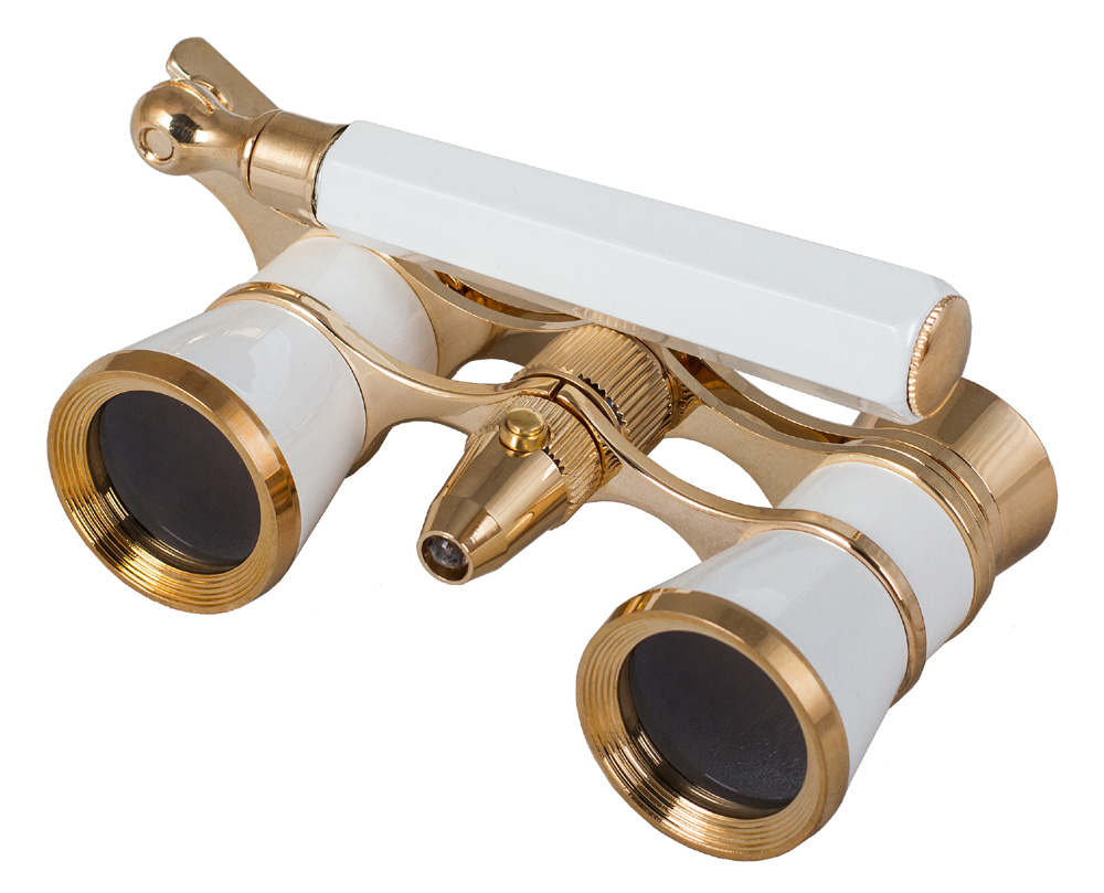 Стильный театральный бинокль-лорнет. Его металлический корпус лакирован белым и имеет золотистую окантовку. Лорнет придаст утонченность образу заядлого театрала. Однако внешний блеск лишь оттеняет его функционал: бинокль снабжен светодиодной подсветкой и центральной фокусировкой, дает 3-кратное увеличение при 25-миллиметровых объективах. В комплекте с биноклем идет мешочек-футляр, салфетка из замши для ухода и руководство по использованию.