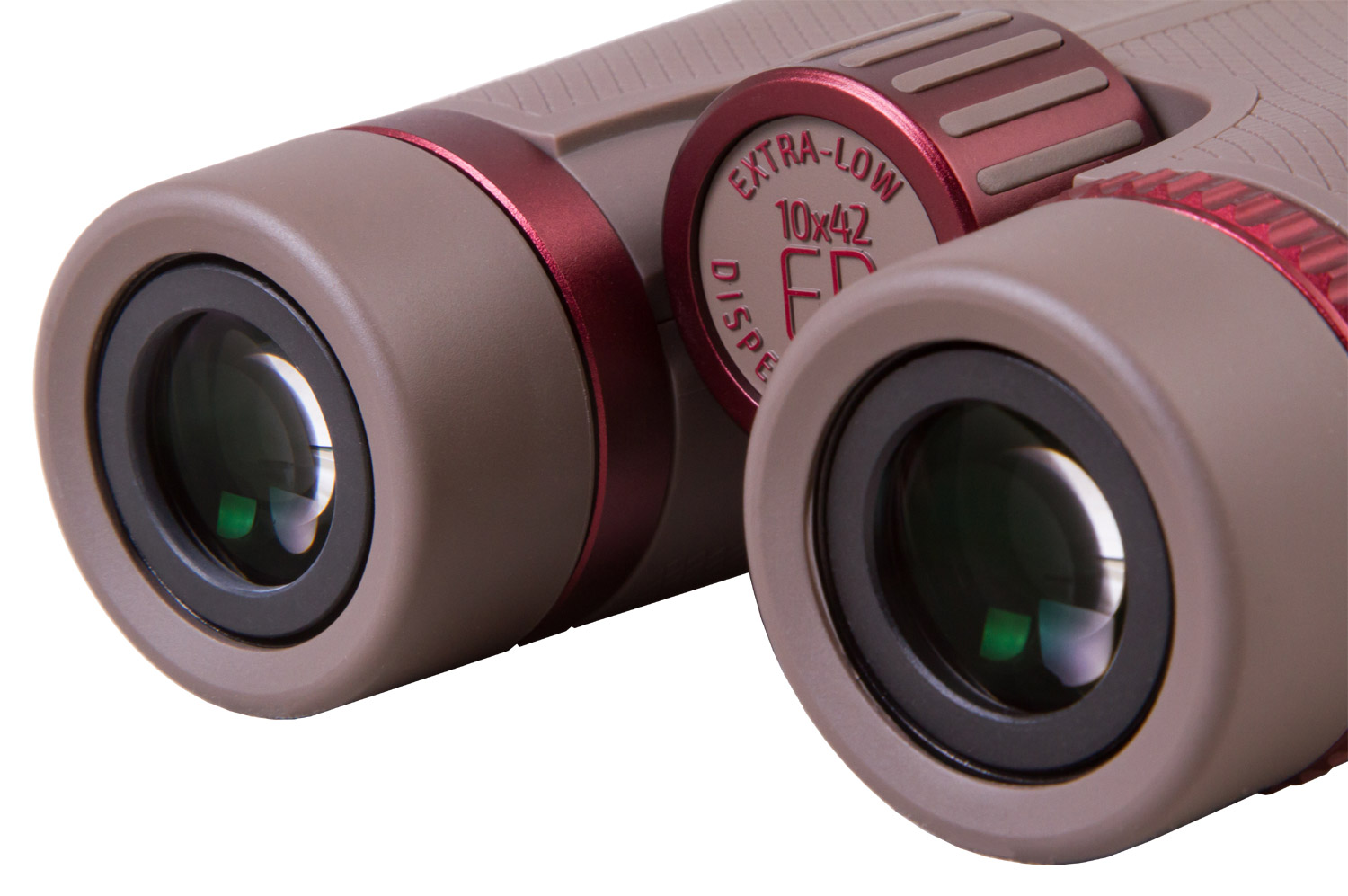 Оптическая конструкция основана на roof-призмах, а также на пятиэлементных окулярах и четырехэлементных объективах. Все они сделаны из полностью просветленного низкодисперсионного ED-стекла. Оптика передает четкую и контрастную картинку без искажений и бликов, радует сочностью цветов и многообразием оттенков, позволяет рассматривать удаленные объекты максимально детально даже при слабой освещенности. Увеличение бинокля составляет 10 крат.