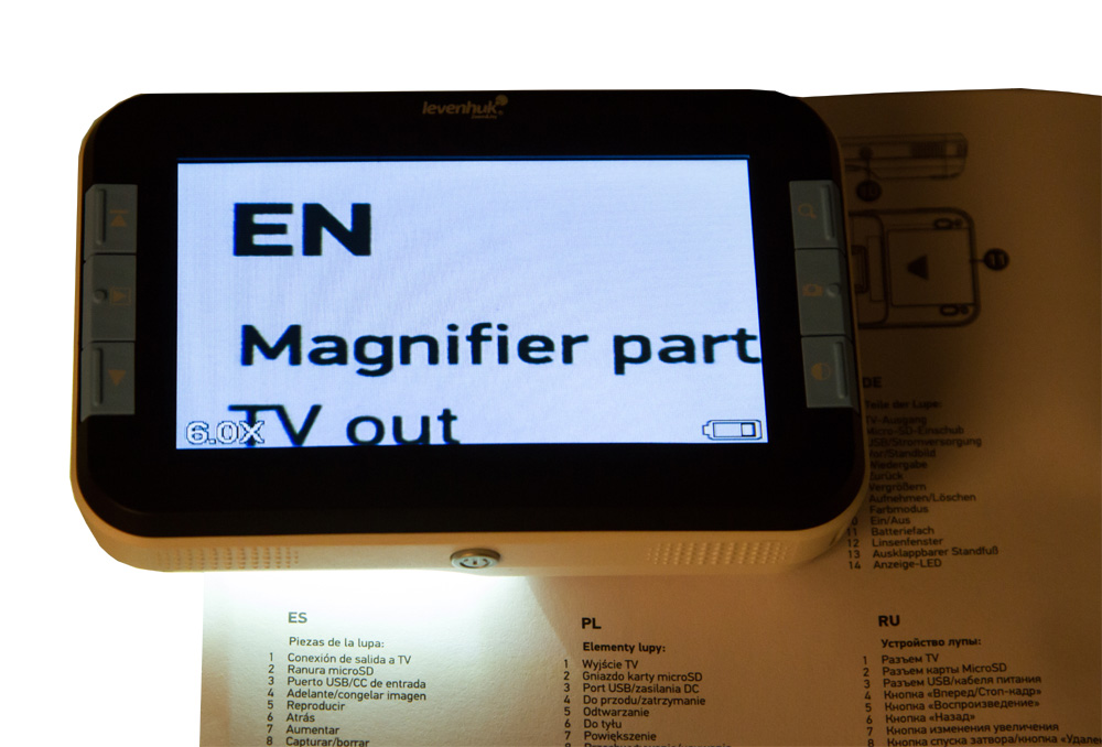 Лупа позволяет увеличивать текст в диапазоне от 6 до 14 крат. Она имеет подсветку, поэтому даже в полной темноте вы сможете четко видеть изображение на экране. Для улучшения детализации воспользуйтесь сменой цветовых режимов – всего доступно семь режимов. Во время чтения вы сможете фотографировать прочитанное. Сделав снимок, вы сможете сохранить его в память подключенного компьютера или на установленную карту памяти.