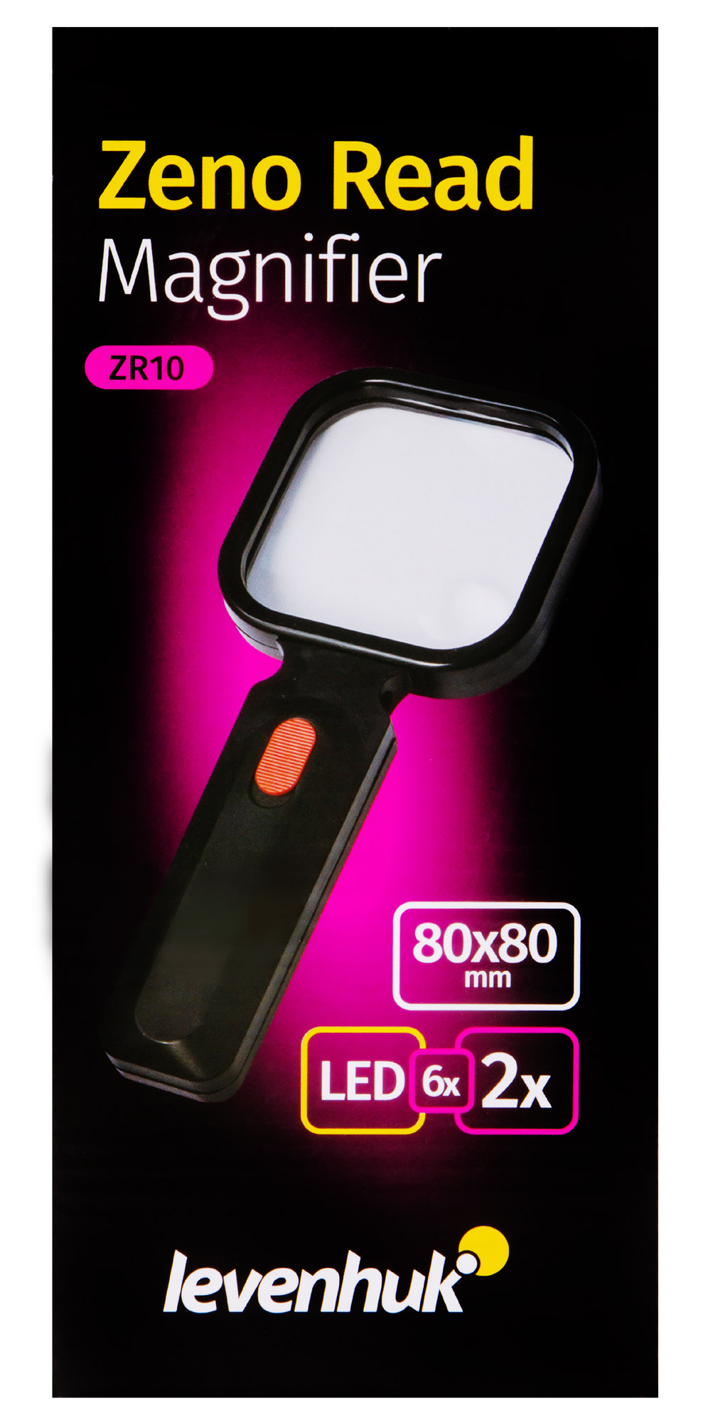 Основная линза лупы Levenhuk Zeno Read ZR10 дает двукратное увеличение, достаточное для чтения мелкого шрифта. Возле линзы расположена светодиодная подсветка, регулировать яркость которой можно с помощью переключателя на корпусе. Светодиоды работают от обычных батареек (приобретаются отдельно). Дополнительная линза дает шестикратное увеличение. Обе линзы и корпус лупы выполнены из легкого практичного пластика.