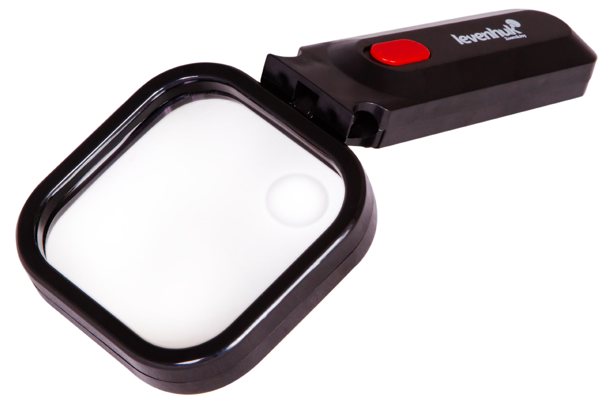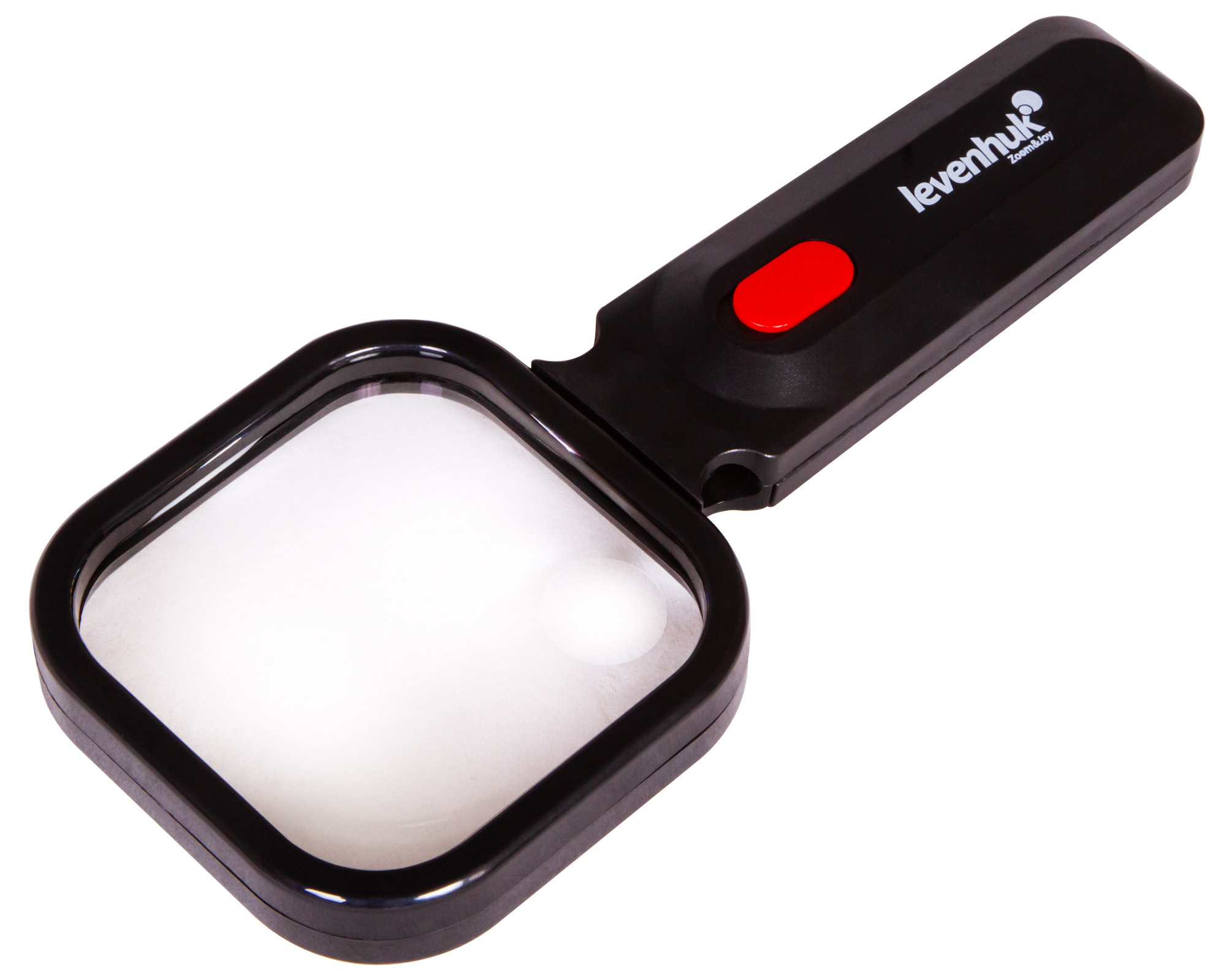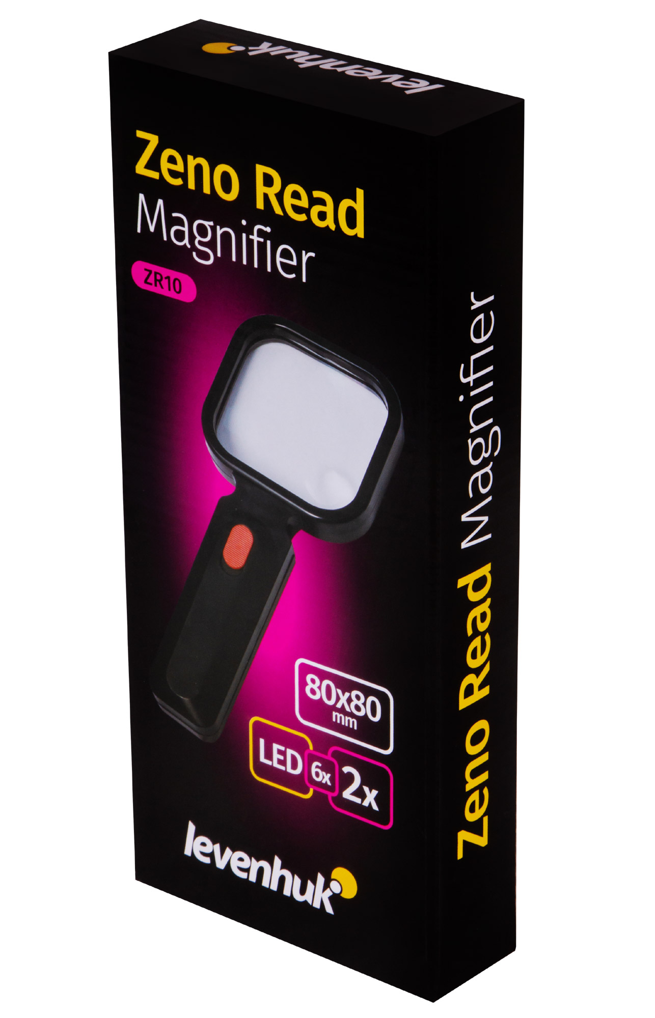 По основной рабочей области квадратная линза лупы Levenhuk Zeno Read ZR10 дает двукратное увеличение. Диаметр дополнительной 6-кратной линзы, имеющей круглую форму, составляет 2 сантиметра. Угол наклона линзы можно регулировать в широком диапазоне, подбирая наиболее комфортное расположение подсветки. Светодиоды работают от стандартных пальчиковых батареек (приобретаются отдельно).