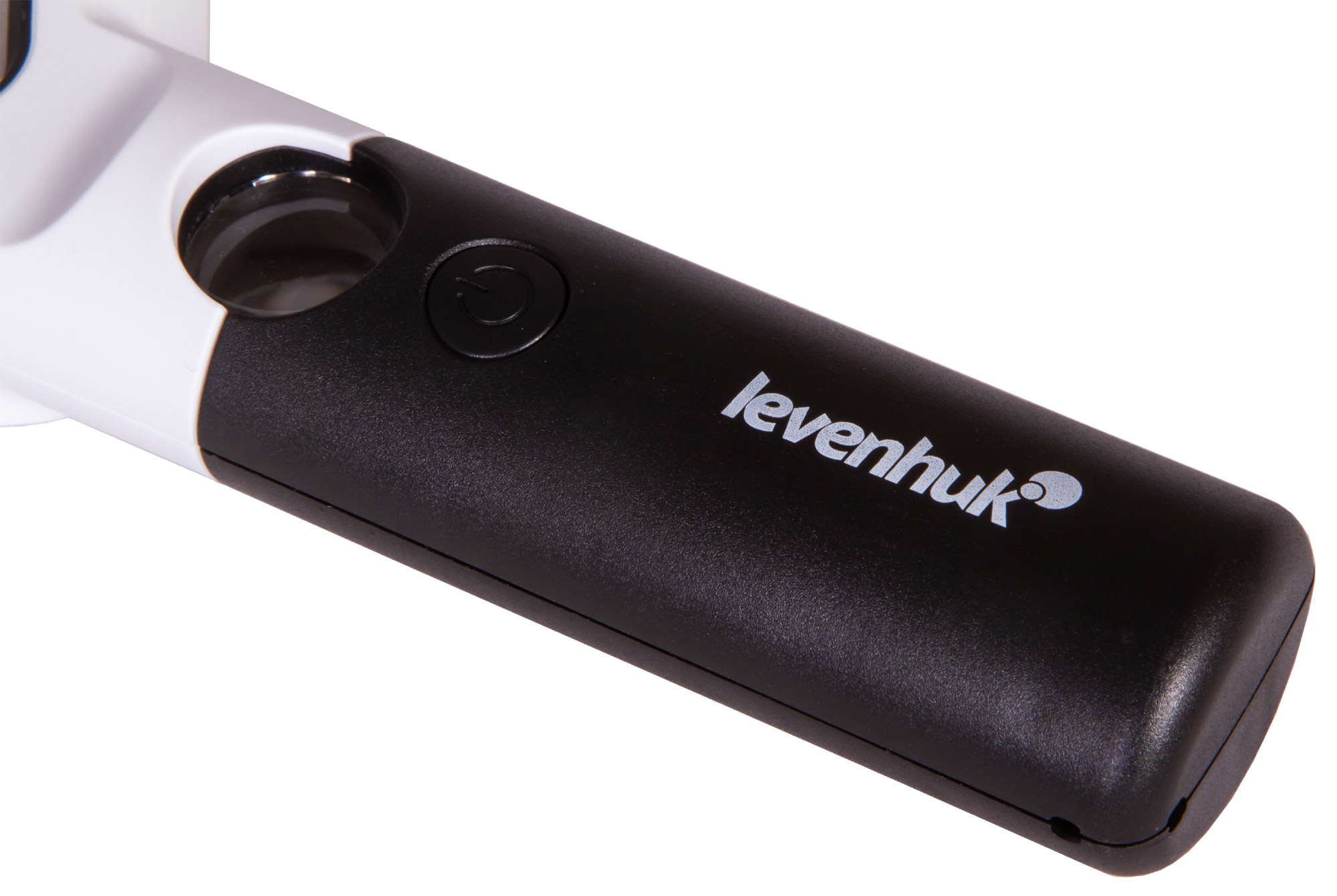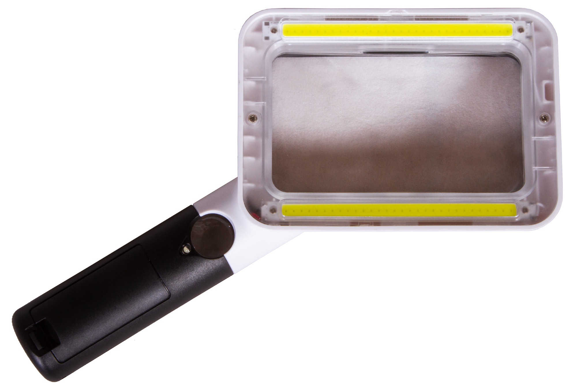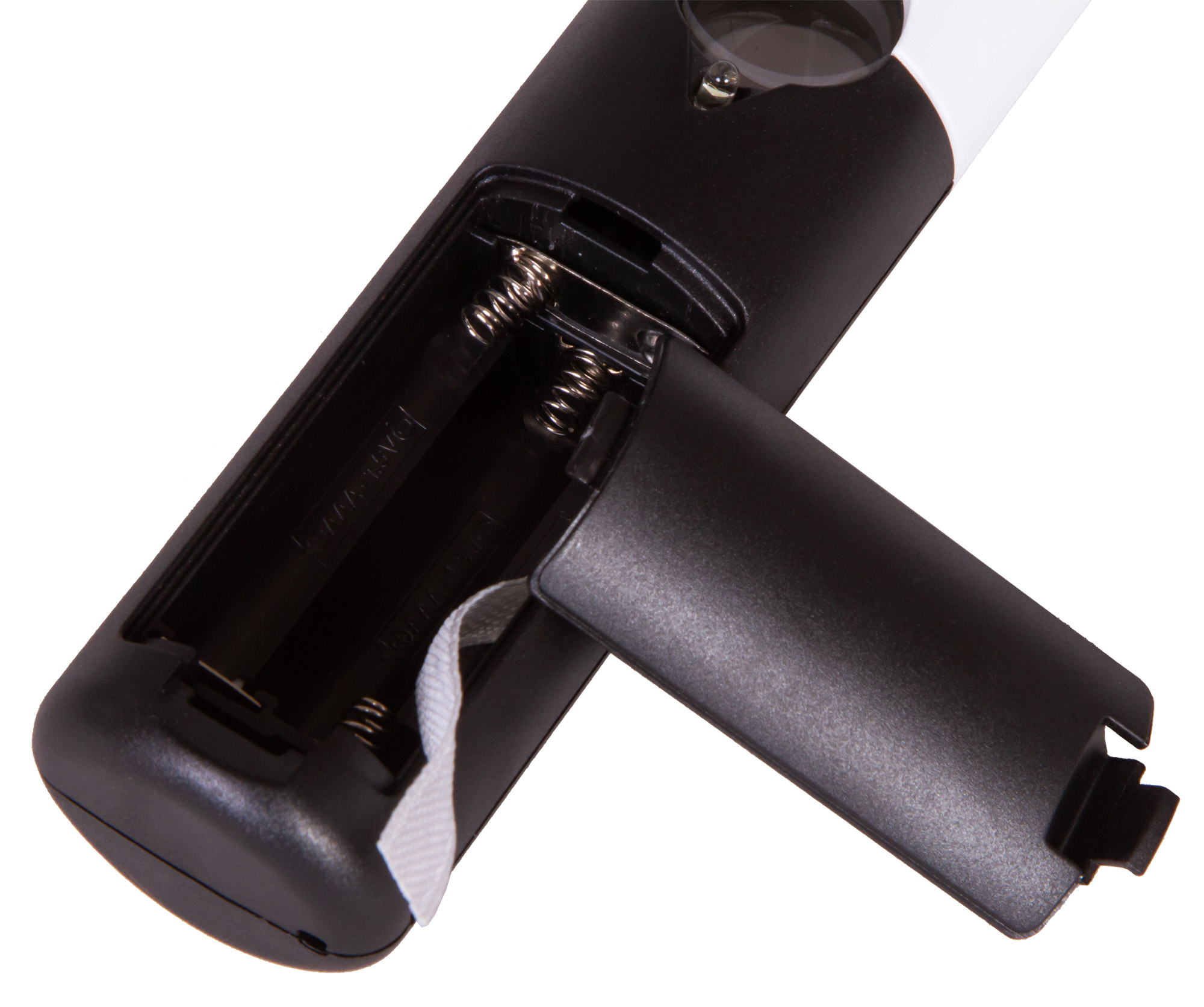Основная двукратная линза позволяет работать с достаточно обширной областью. В ручку лупы встроена небольшая дополнительная линза круглой формы – с ее помощью можно рассмотреть мельчайшие детали на мощном 20-кратном увеличении. Для наилучшего результата можно воспользоваться подсветкой, работающей от батареек ААА (в комплект не входят). Она включает в себя два COB-светодиода. Еще один светодиод, классического типа, размещен у малой линзы. Интенсивность подсветки можно регулировать.