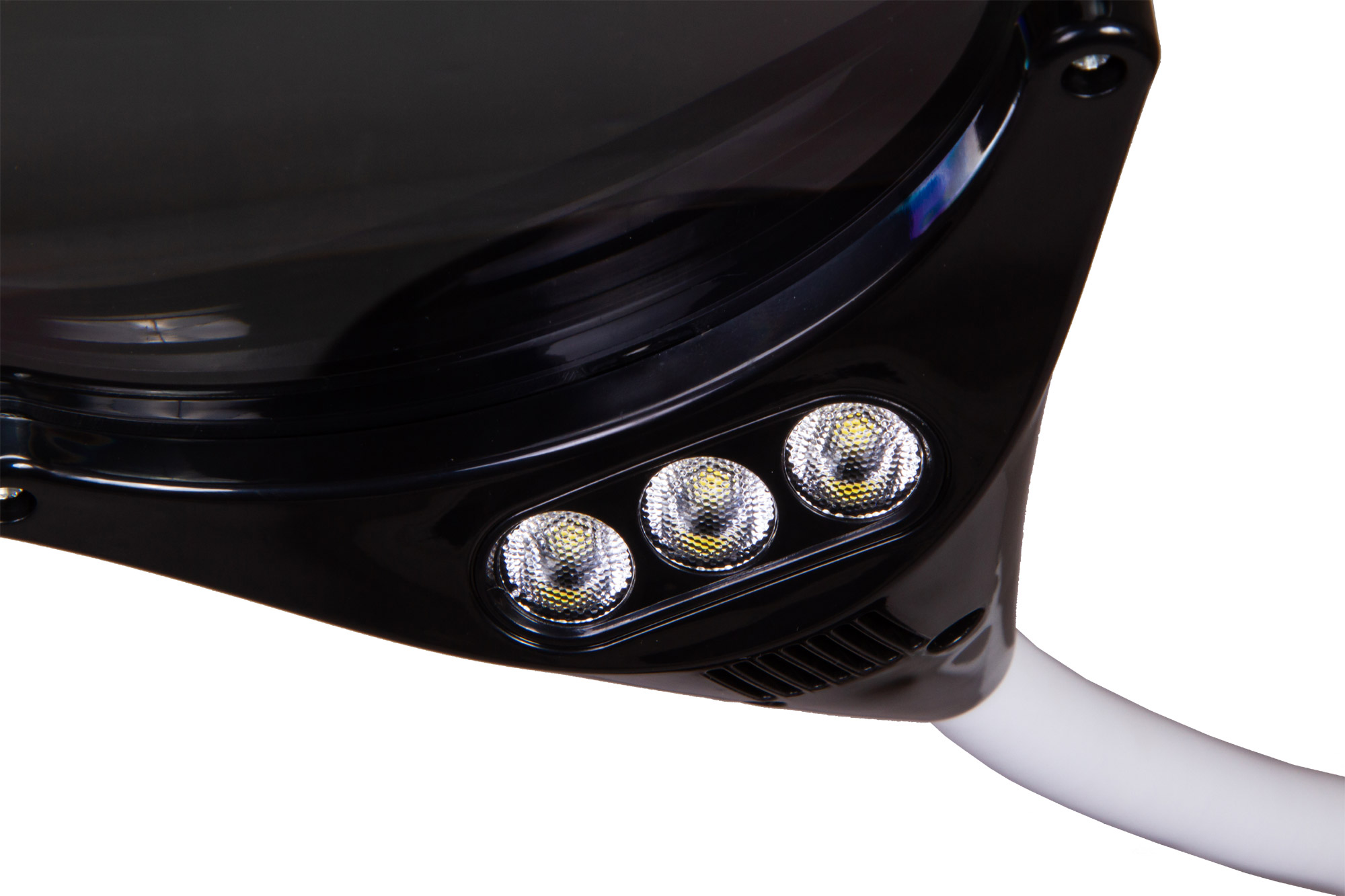 Все элементы лупы сделаны из пластика. Несмотря на это, лупа прочная и надежная, а оптика передает четкую и контрастную картинку без искажений. Гибкий штатив позволяет легко наклонять линзу, выбирая наиболее удачный угол обзора. Прямо под линзой находится подсветка – светодиоды создают равномерное и яркое освещение, которого хватает для работы в полной темноте. В основании находится регулятор яркости подсветки – всего доступно 4 разных уровня освещенности.