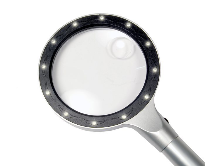 Модель оборудована встроенной подсветкой из 12 светодиодов. Светодиоды встроены в корпус лупы по кругу, что обеспечивает равномерное освещение всей рабочей поверхности. Отличительная особенность подсветки – возможность регулировки уровня освещения. Вы можете включить только 6 или все 12 светодиодов: для этого нужно нажать на кнопку включения один или два раза соответственно.