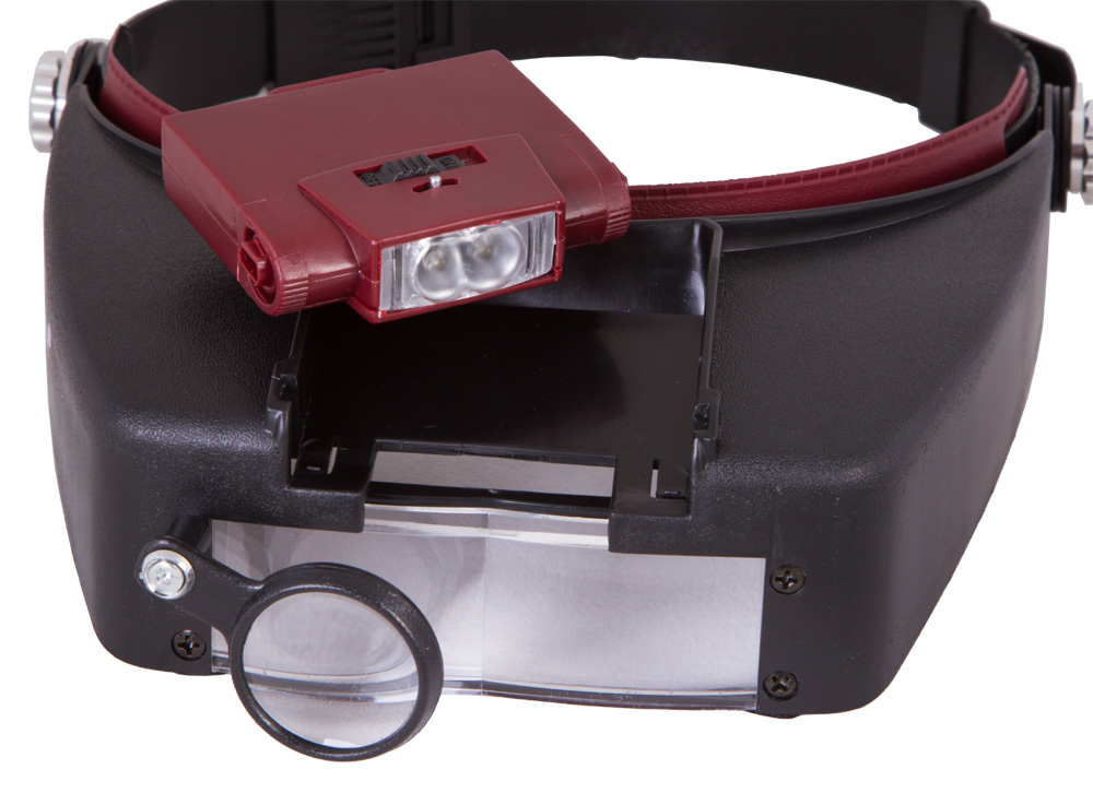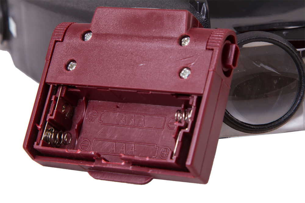 Лупа Levenhuk Zeno Vizor H2 имеет встроенную подсветку. Ее удобно включать и выключать тумблером на корпусе. Яркости светодиодов вполне хватит для работы при плохом освещении или даже в условиях его полного отсутствия. Для работы подсветки требуются батарейки (в комплект не входят).