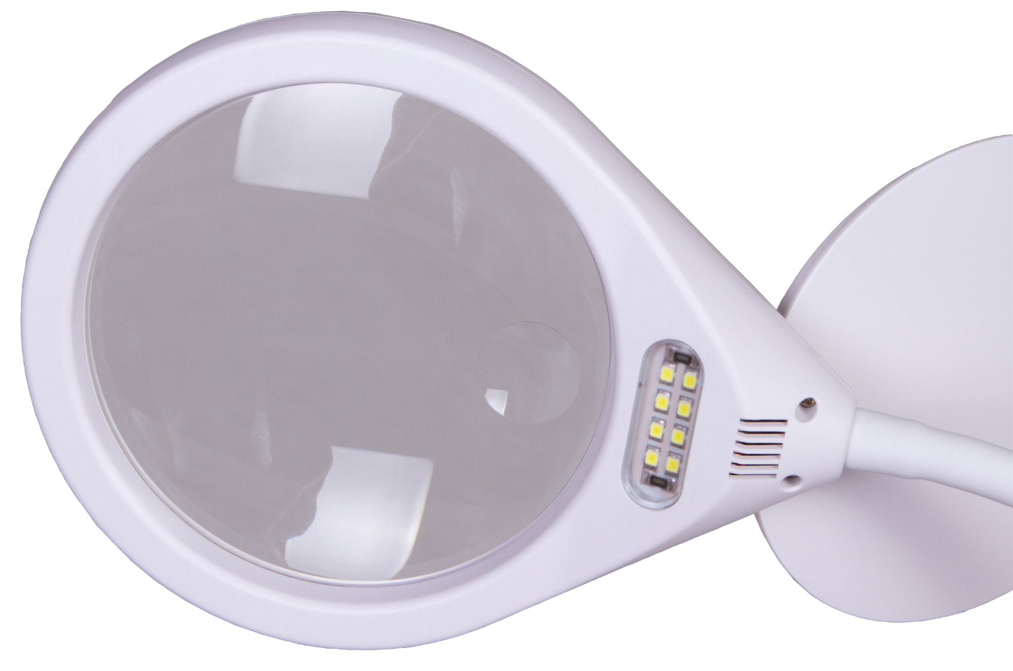 Линза лупы Levenhuk Zeno Desk D19 позволяет изучать область размером до 120 мм на двукратном увеличении. На небольшой области диаметром 25 мм доступно более мощное увеличение – в 6 крат. Восемь ярких светодиодов возле линзы позволяют рассматривать объекты под увеличением даже в темноте. Подсветка имеет регулировку яркости и работает от электросети. Закончив работу с лупой, можно закрыть линзу откидной защитной крышкой – она не позволит пыли скопиться на поверхности.
