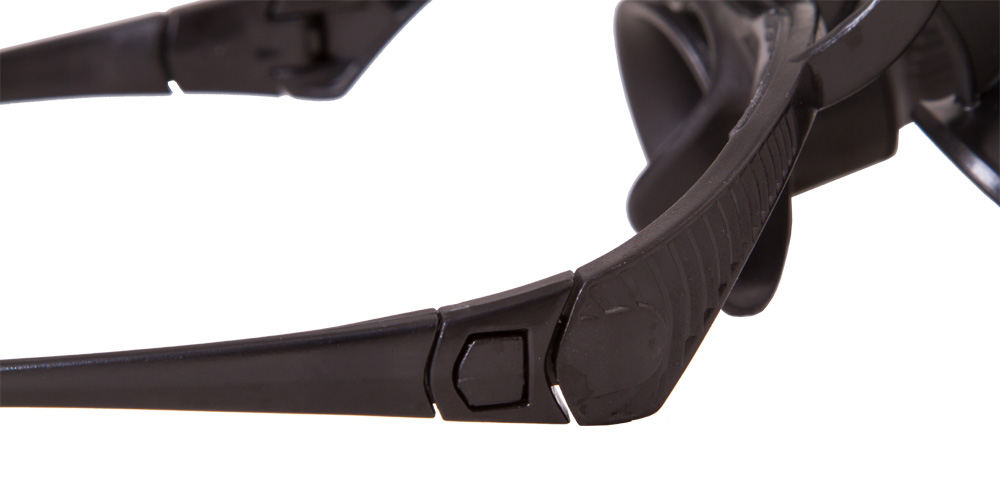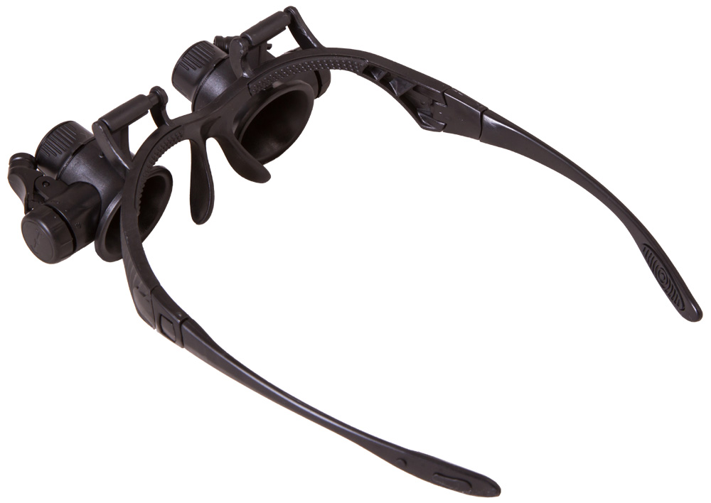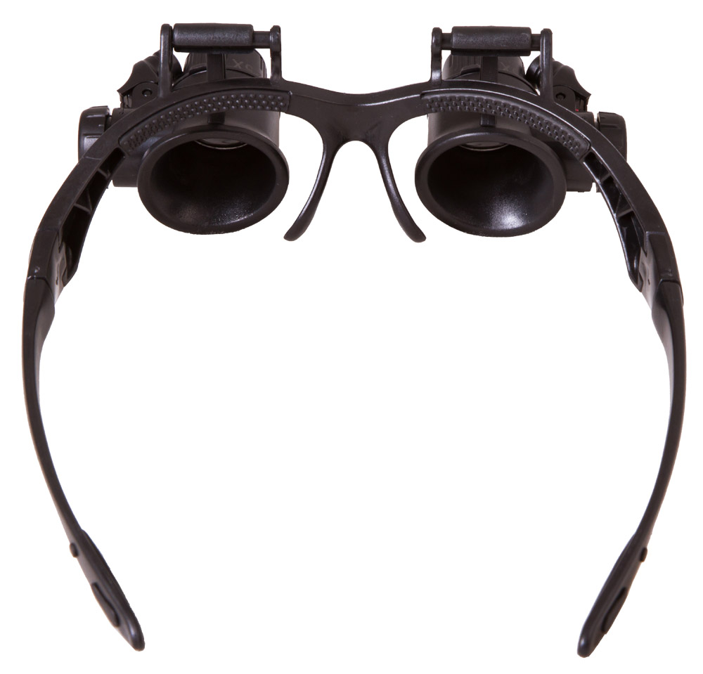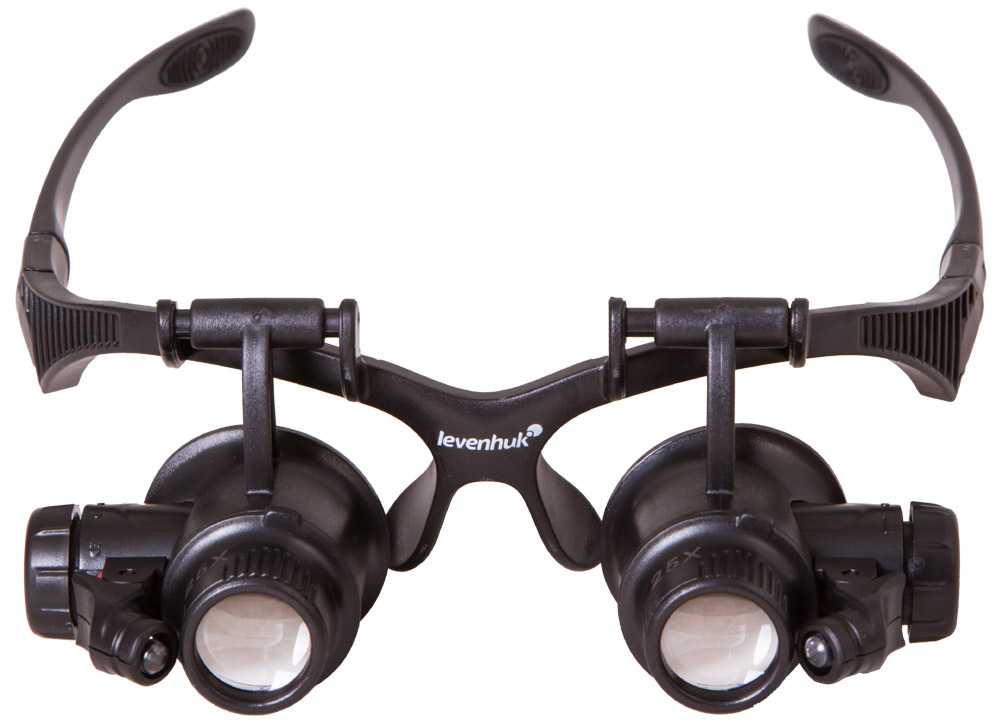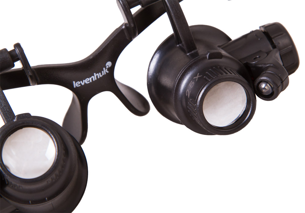 Лупа комплектуется сменными линзами для обоих глаз. Прямо «из коробки» вы получите диапазон увеличений от 10 до 25 крат. Встроенная подсветка пригодится для работы при скудном освещении. Яркие светодиоды расположены по бокам оправы и позволяют равномерно освещать рабочую область. Направление подсветки можно регулировать вручную. При необходимости во время работы любую из линз можно отвернуть наверх, чтобы посмотреть на рабочую область невооруженным глазом.