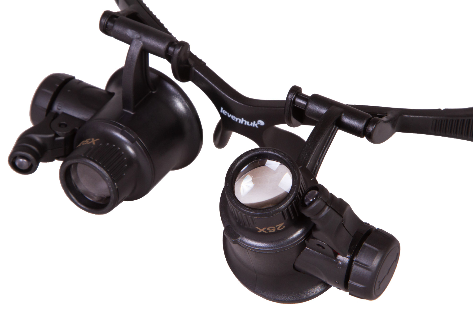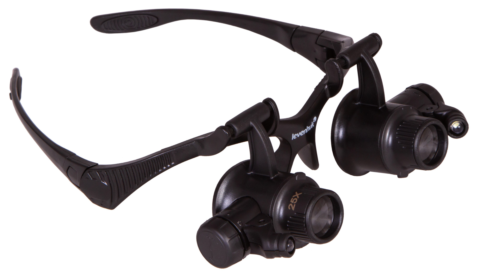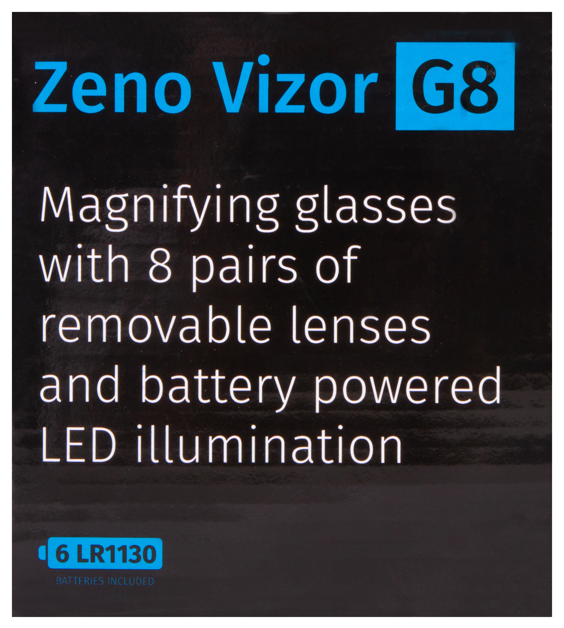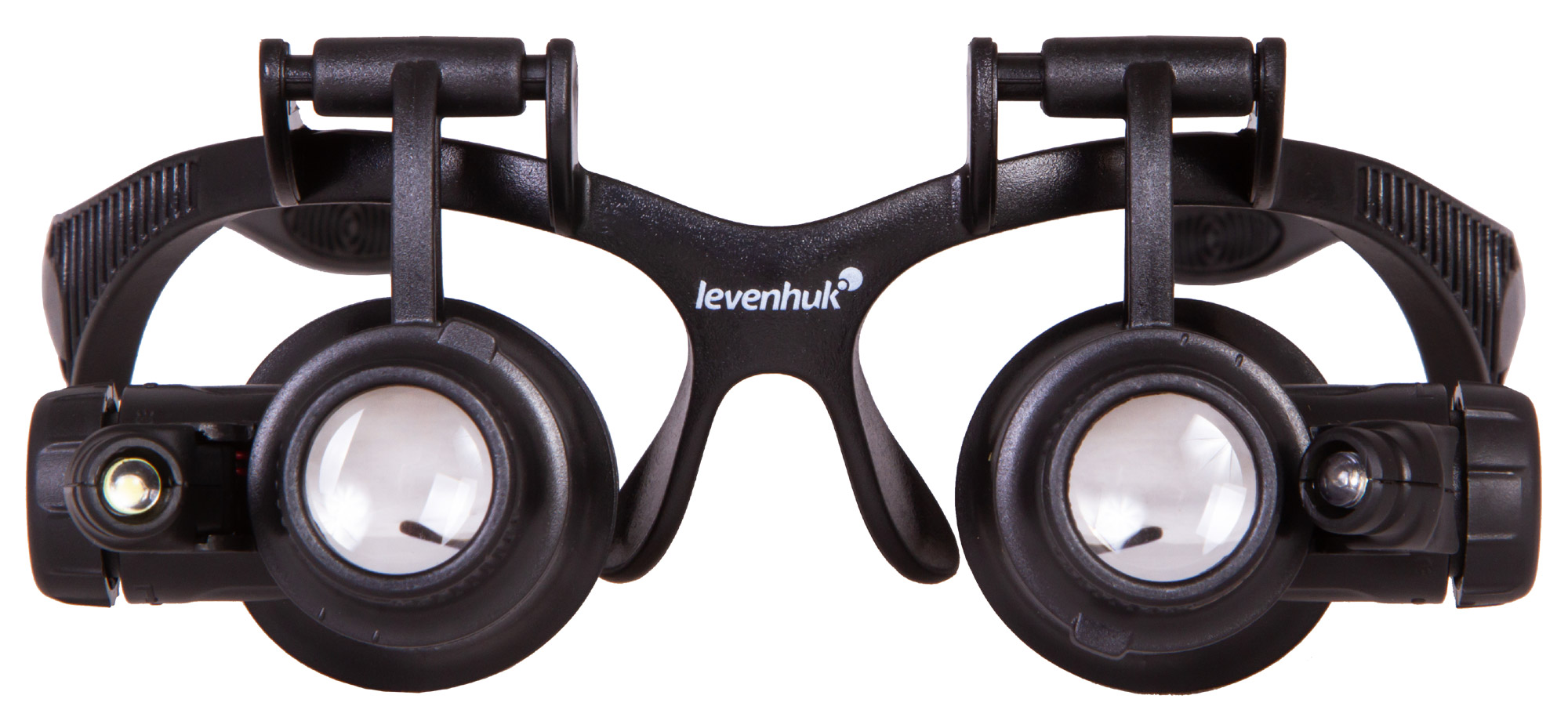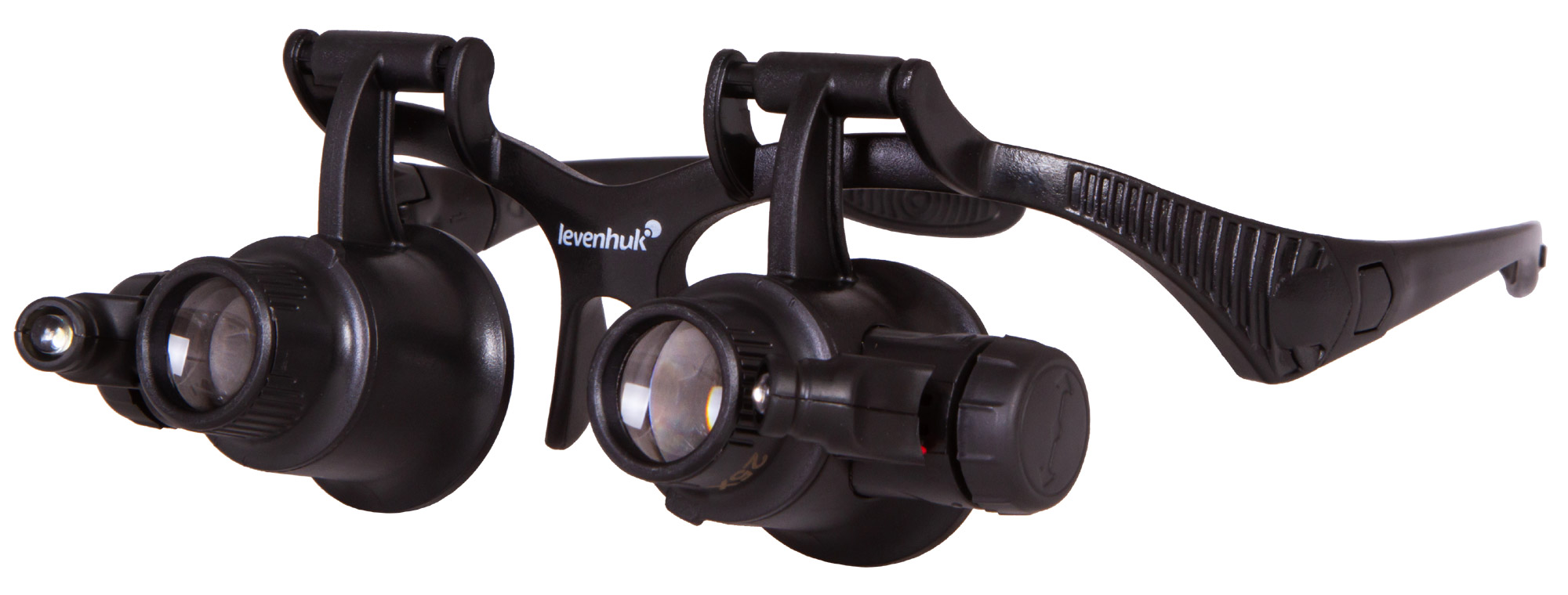 Лупа Levenhuk Zeno Vizor G8 поставляется с 8 комплектами парных линз разной кратности – от 2,5х до 25х. Линзы изготовлены из небьющегося оптического пластика высокого качества. Корпус выполнен из легкого пластика и практически не ощутим при ношении. Рядом с линзами располагаются два светодиода, работающие от батареек (есть в комплекте). Угол наклона светодиодов можно свободно регулировать. Яркая подсветка и портативный характер лупы позволяют работать даже в условиях отсутствия электричества.