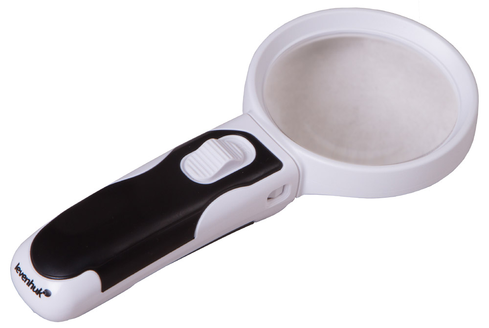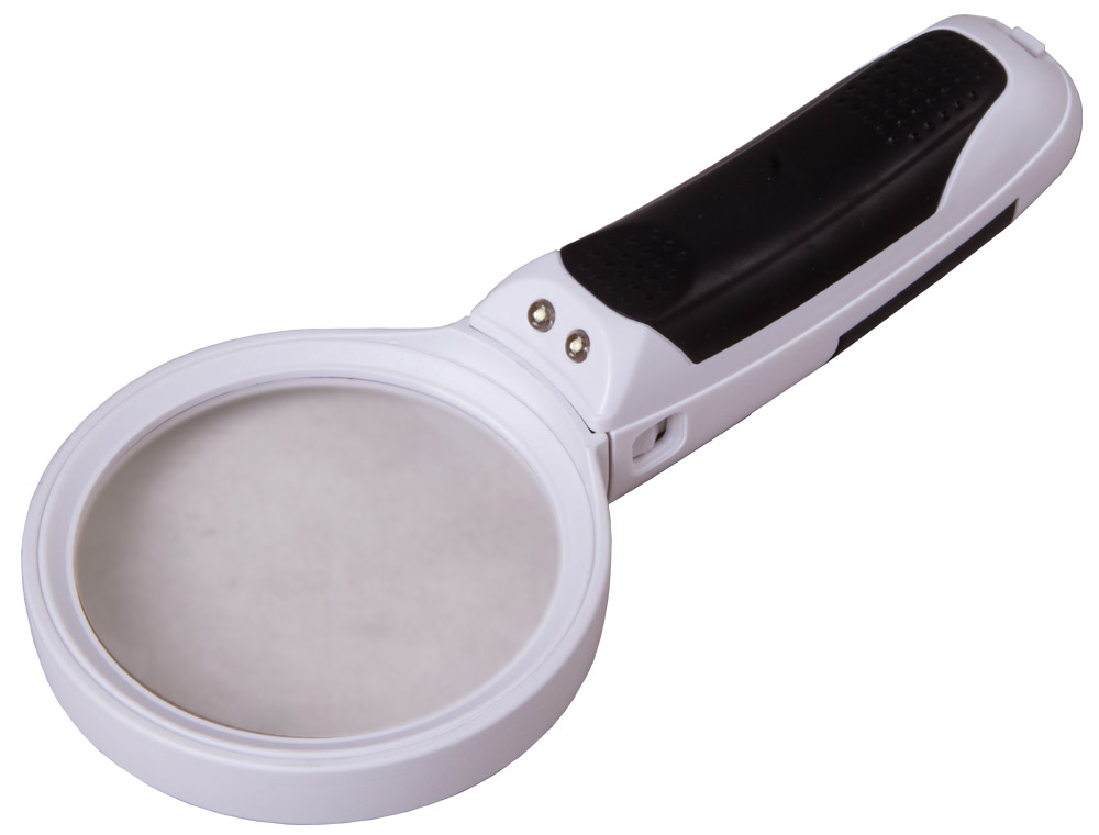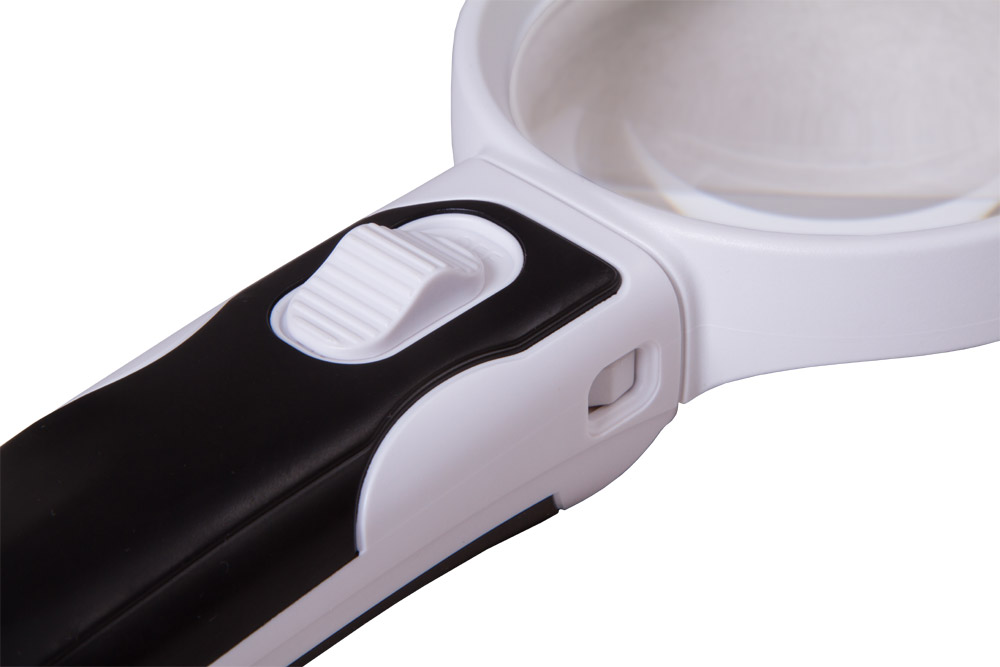 Встроенная подсветка позволяет работать в полной темноте. Два светодиода расположены в ручке и хорошо освещают все пространство под линзой. Они работают от обычных батареек (нет в комплекте).