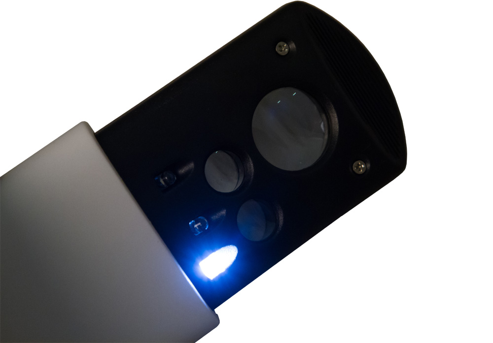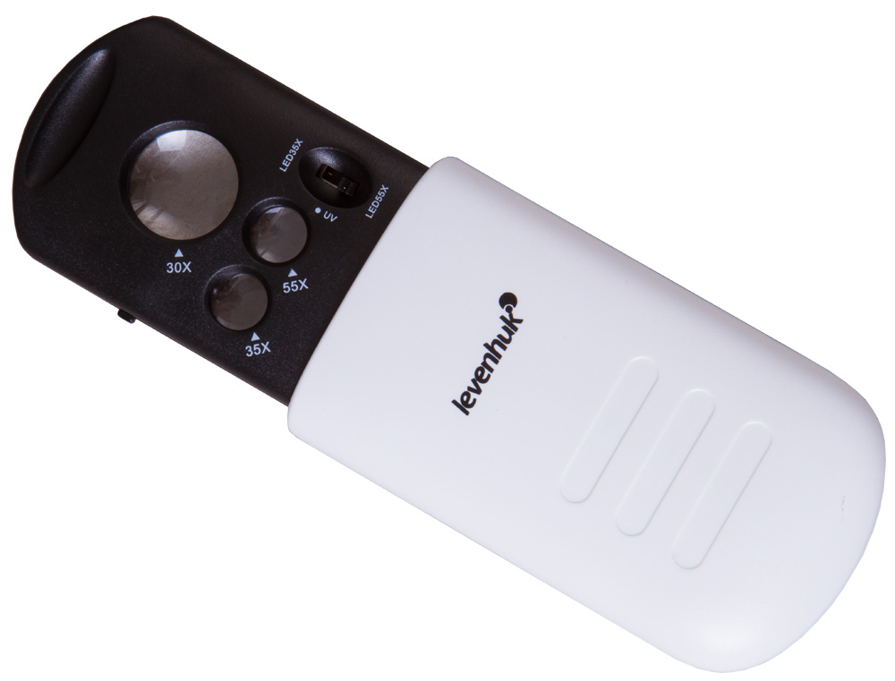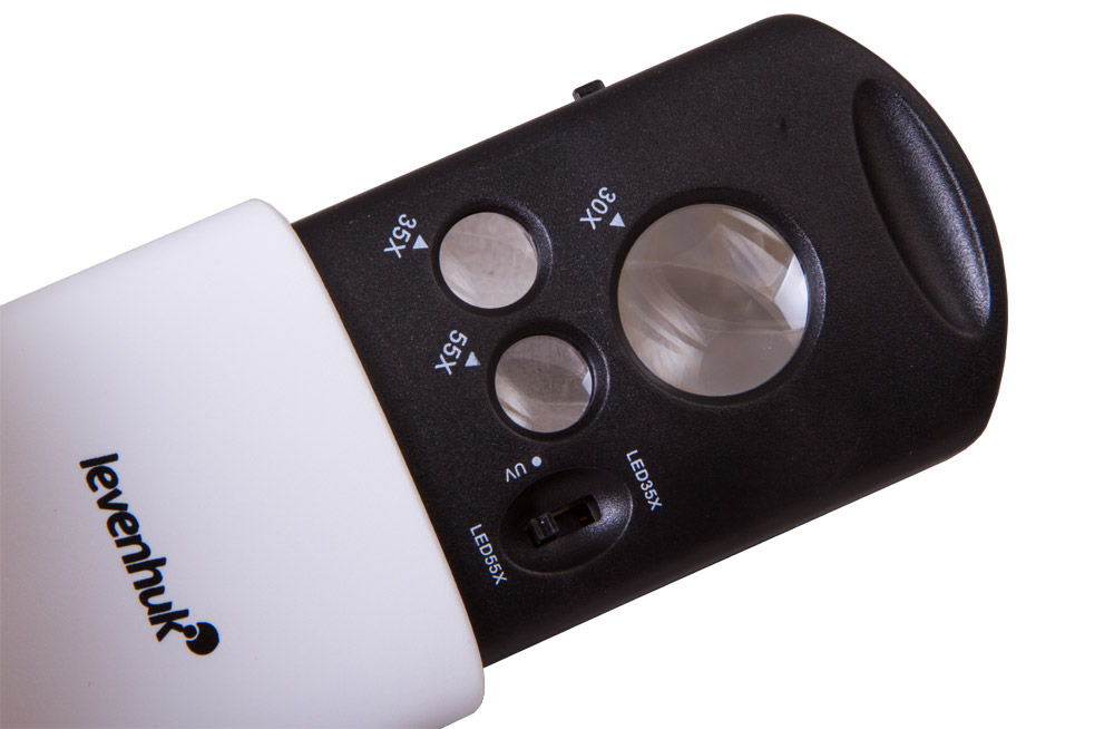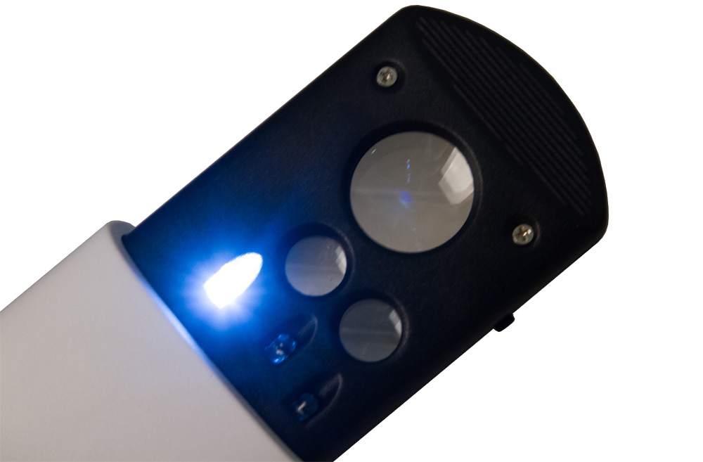 Лупа снабжена двумя подсветками: светодиодной и ультрафиолетовой. Первая нужна для освещения рабочей области при слабом внешнем освещении, вторая – для оценки подлинности купюр.