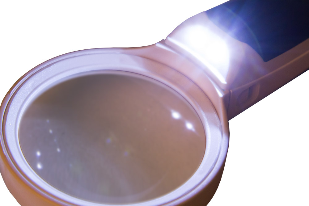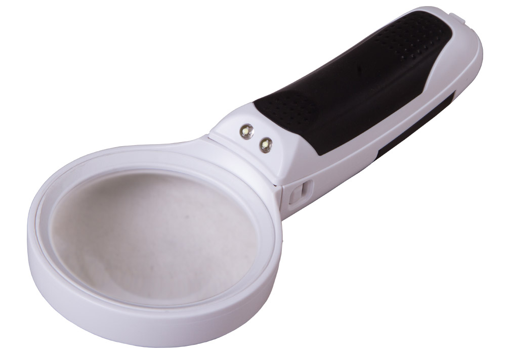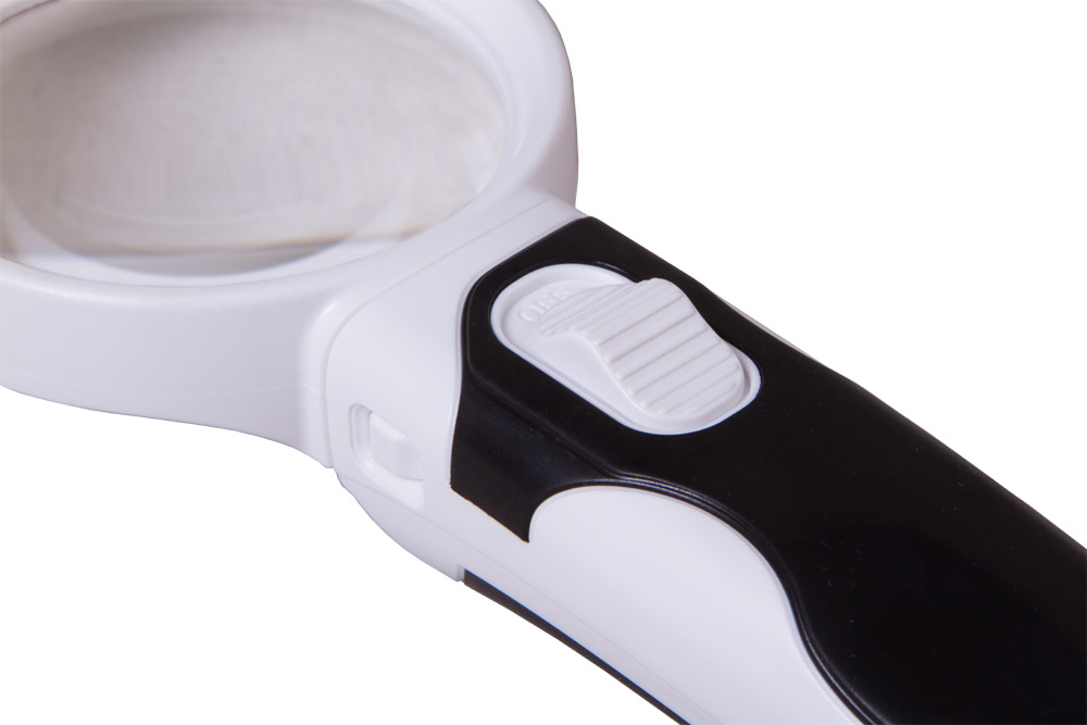 Лупа снабжена встроенной подсветкой. Она состоит из двух светодиодов, за включение и выключение подсветки отвечает переключатель на ручке. Подсветка яркая и дает хорошее освещение рабочей области под линзой даже в полной темноте.